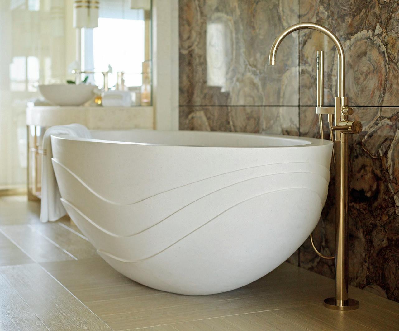 Aboard Amels’ Winch-designed 68M/222’ NENINKA (ex. AURORA BOREALIS), the stone bathtub in the Owner’s suite, backed by a wall of petrified wood, is a labour of love. “We wanted the sculptural form of the bathtub to do the talking so we knew it was important to make the tub from one single block of Cream Liria stone,” says Greig Jolly, Associate at Winch Design.