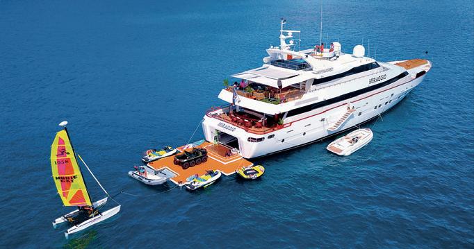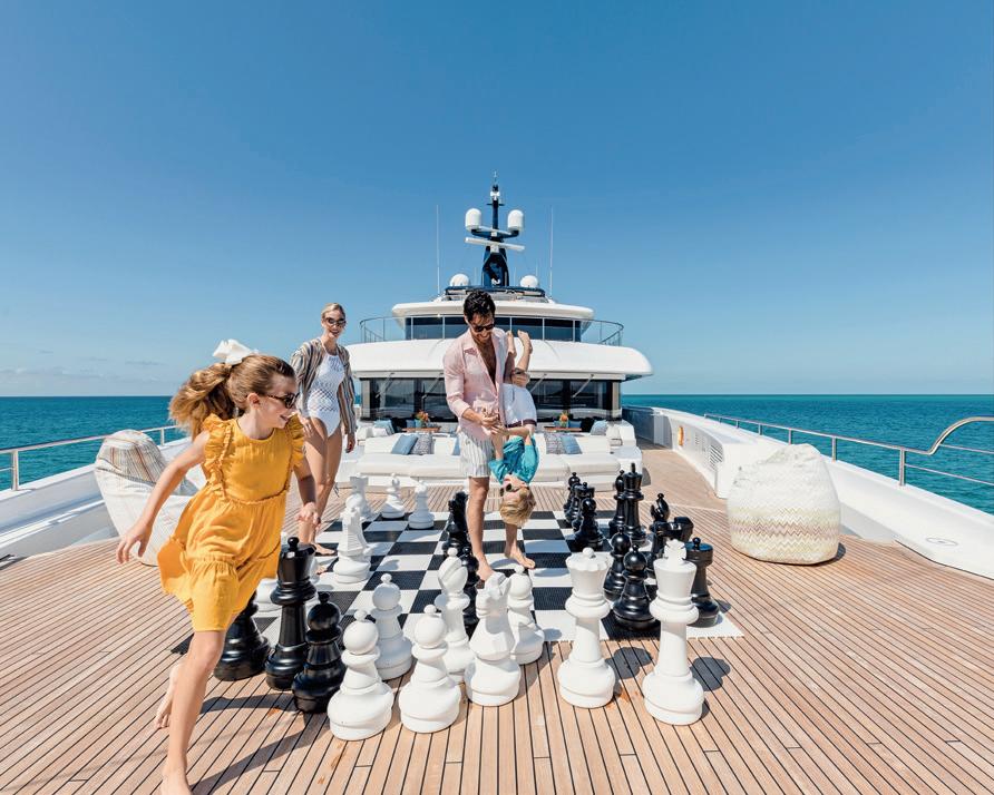 Clockwise from top, Toys for all ages are at your disposal; Family afternoons on board WHEELS (pg 112); Every generation can enjoy a yacht (LATITUDE, pg 140); Yachts are ideal for children; The ultimate outdoor movie night on board