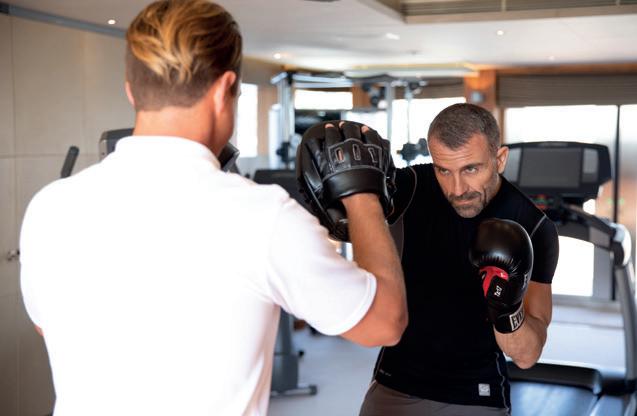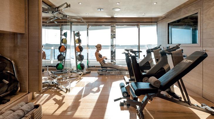 And even better than your gym on land, yacht gyms often make the most of the natural environment. What better way to start your day than with an al fresco treadmill session overlooking the ocean in the dedicated outdoor gym on board 49M/162‘ VIBRANCE (for sale and charter), or in a glass gym on the sundeck with 360-degree views? On 44M/144’ AMADEUS I (for charter), after your workout in the beach club gym, take a few steps to the sauna to wind down (turn to page 26 for more about well-being on board). Or why not choose an onboard pool with counter-flow current for your workout? And if you need a fitness professional on hand, crew members often double up as personal trainers: your workout in the gym on 55M/180’ KAMALAYA (for charter) can be accompanied by an onboard personal trainer and some yachts, including LATITUDE, even have on-crew sports therapists.