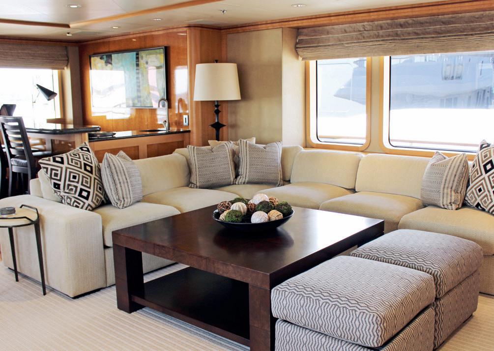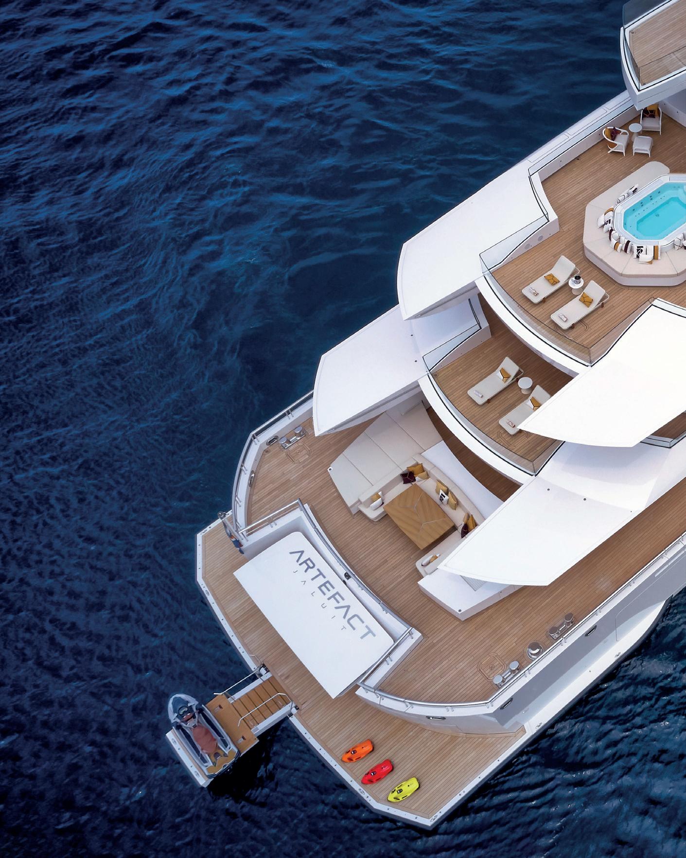 Along with the Owner, Captain Clark spent eight months and $110,000 building ARTEFACT’s family deck level to scale out of wood and Tyvek construction wrap before the first cut of steel. “It helped us to figure out how much room the Owners need to comfortably live aboard.”