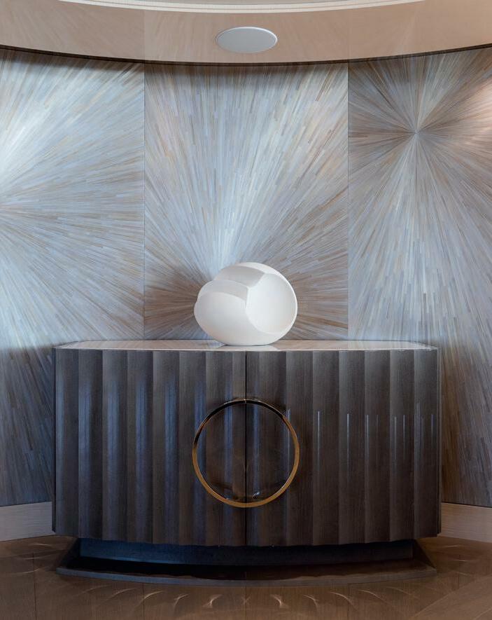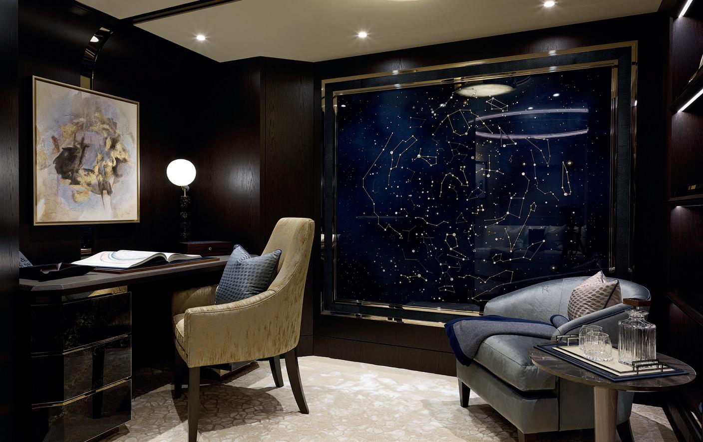 In NENINKA’s Owner’s study, a constellation artwork, which took eight months to create, was brought to life using stained birds-eye maple, almond gold inlays, mother-of-pearl and coloured shells. A sand-shading technique was used to give depth and create the illusion of looking towards the stars.