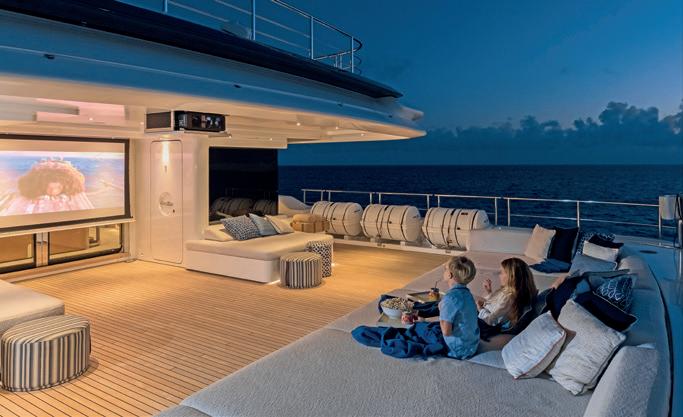 connectivity, playing live with friends can today be done from the middle of the Caribbean Sea, just as at home. For the big-screen experience, the crew can set up a gaming space around the yacht’s biggest screen, for example on FORMOSA’s UHD 4M x 1.5M / 13’ x 5’ screen or in WHEELS’ dedicated 12-seater cinema. By night, you can even enjoy gaming in an outdoor cinema, found today on many yachts and able to be set up quickly by the crew.