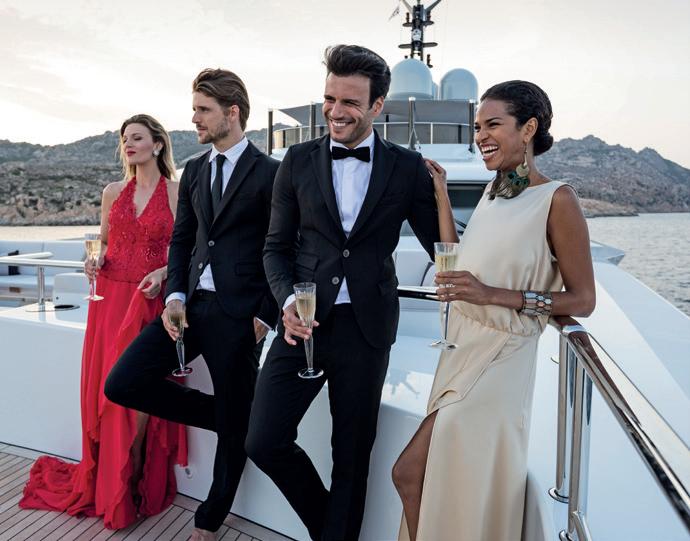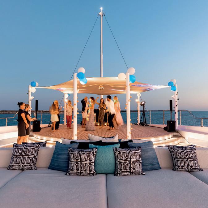 Clockwise from top left, Host the ultimate party on board; Themed evenings can be arranged by the crew; Ready for a glittering evening on board; Deck spaces can be decorated for any celebration