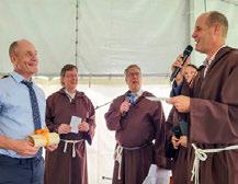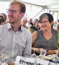 Ehren des Jubilars ebenso auch den Einsatz aller am morgendlichen Abschiedsgottesdienst Beteiligten, insbesondere auch des erweiterten Kirchenchors, und sprach Dank aus für den wunderbaren Blumenschmuck. Und effektiv: Die Vorbereitung für ein Fest für 300 Personen hatte einiges an Planung verlangt. Sozialdiakon Sam Ammann, der offensichtlich auch Petrus für diesen Anlass hatte bewegen können, seine Schleusen für einmal dichtzuhalten, konnte zufrieden berichten, dass trotz vollem Zelt mehr als genügend Essen und Trinken vor Ort sei und man hier feiern könne wie bei einem vergrösserten Picknick. Sicher hat nebst Petrus + auch Paulus von oben milde zugelächelt, er, der von Beruf ja Zeltbauer in Tarsus war, mithin also als einer der Vor-Erfinder unserer modernen Plachen. Grussworte und Danksagungen überbrachten nicht nur Kirchenratspräsidentin Christina Aus der Au, sondern katholischerseits auch Domherr und Frauenfelder Pfarrer Roland Häfliger, der mit seinem Pfarreiseelsorger Thomas Markus Meier der Feier beiwohnte. Sie waren offensichtlich an-