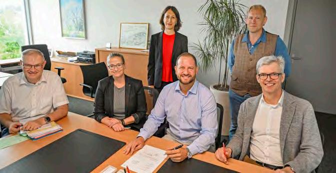 (v.l.) Michael Lerch, Grundbuchverwalter; Stadtschreiberin Bettina Beck, Stadträtin Andrea Hofmann Kolb, Karim Twerenbold, Verwaltungsratspräsident der Twerenbold Reisen Gruppe; Christoph Anneler, Bereichsleiter Eigentümervertretung und Stadtpräsident Anders Stokholm bei der Vertragsunterzeichnung.