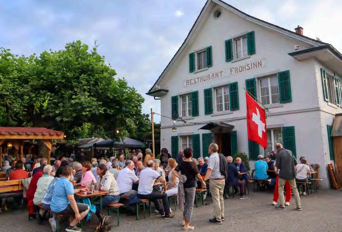 Das Restaurant Frohsinn im Quartier Kurzdorf ist für eine beschwingte Party genau die richtige Adresse. 150 Gäste geniessen unter lauschigen Bäumen in der Gartenwirtschaft einen Abend in geselliger Runde. Tanzpaare drehen sich im Kreis. Füsse wippen im Takt, einige Besucherinnen summen bekannte Lieder mit. Zur Stärkung gibt es leckere Grilladen und ein reichhaltiges Salatbuffet.