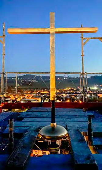 Der Einsatz der Familie Krähemann geht ins Baujahr 1958 zurück, wo der damals 23-jährige Zimmermann, Ludwig Krähemann, am Bau des Pfarrhauses beteiligt war. Als interessierter junger Mann nutzte er die Gelegenheit, das goldene Kreuz auf dem neu erbauten Kirchturm auszumessen. Dieses besagte Kreuz wurde heuer mit 359 Goldplättchen in spezieller Technik neu überzogen. Da liess es sich der mittlerweile 89-Jährige nicht nehmen, nach 65 Jahren erneut aufs Kirchendach zu steigen und das strahlende K reuz in Augenschein zu nehmen.