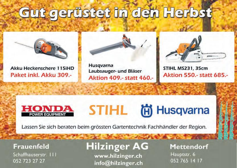 Ein buntes Festprogramm Geniessen Sie eine feine Gratiswurst von OTTO’S mit einem knusprigen Gratis-Bürli von Coop. Beweisen Sie Ihr Können beim «Kürbis-Wurfspiel» mit tollen Preisen und mit etwas Glück wird Ihr Einkauf von unserer grosszügigen «Herbstfest-Hexe» bezahlt. Unsere Geschäfte erwarten Sie gerne mit vielen weiteren spannenden Aktionen und Attraktionen. Öffnungszeiten Samstag, 29. Oktober 2022, 9 bis 18 Uhr* Sonntag, 30. Oktober 2022, 11 bis 17 Uhr Festbetrieb, 11 bis 17 Uhr *Coop ab 8 Uhr Herbstfest mit Gratiswurst und Sonntagsverkauf 29. und 30. Oktober 2022 allmend center JAHRE Frauenfeld-Ost | allmendcenter.ch Bancomat ALL_Herbstfest22_offline_Inserat_ZTG_286x108.indd 1 07.09.22 17:50 GRATIS Finanzwissen für Sie! THURGAUER KOMPAKTSEMINARE Jetzt informieren und anmelden: tkb.ch/seminar Finanzen einfach und kompakt erklärt. Die TKB bietet kostenlose Seminare zu verschiedenen Finanzthemen in kleinen Gruppen oder online an. inserat_ff_woche_112x70_Seminare_TKB.indd 1 28.03.22 15:56