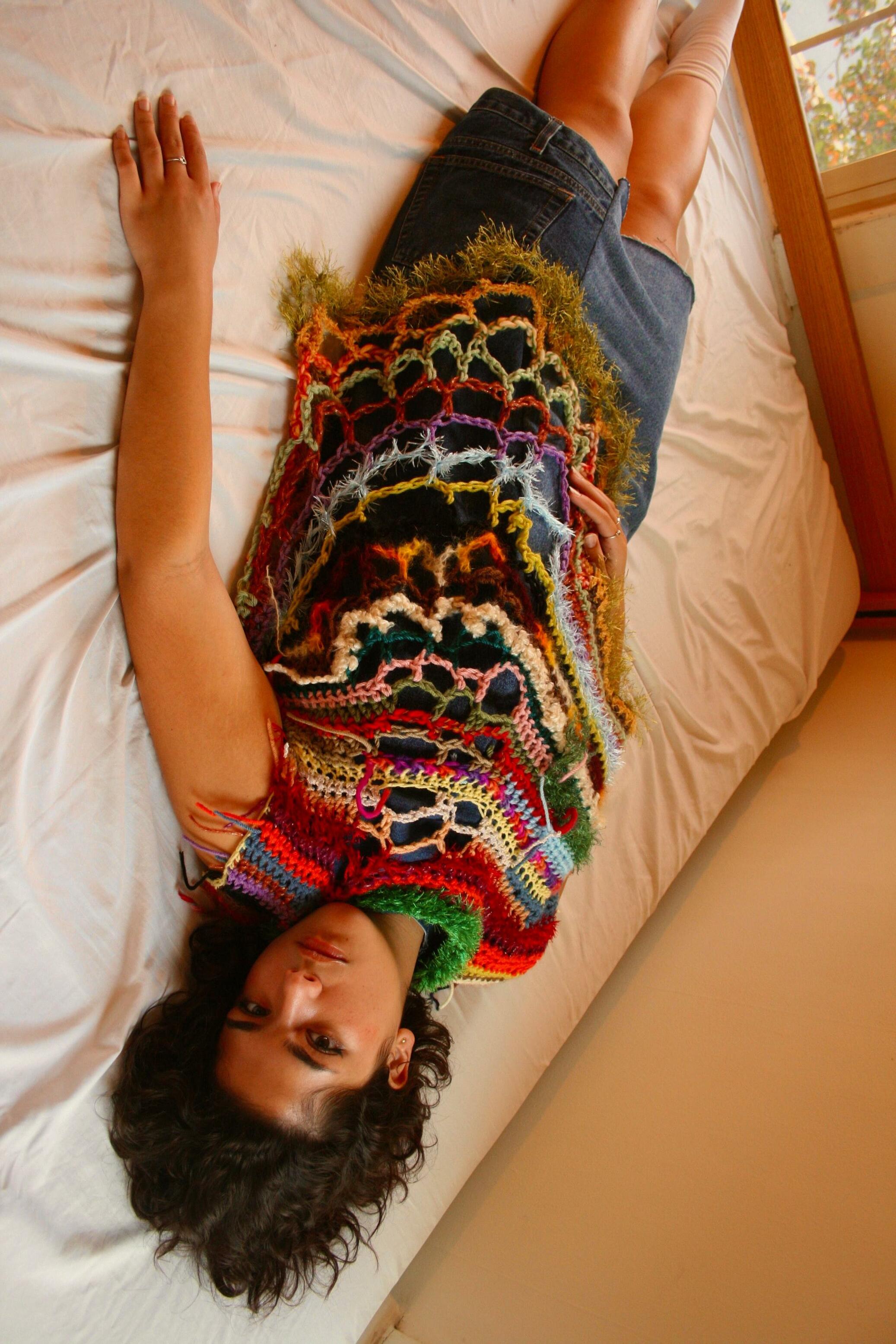 V: Yeah, I thrifted it last year. I found it last year and thought it was so cool, but I haven’t worn it yet. I just haven’t thought of what to wear it with yet. I love the pattern and texture of it. It reminds me of an archive piece, sort of from a different era. I love the abstract shapes and stuff.