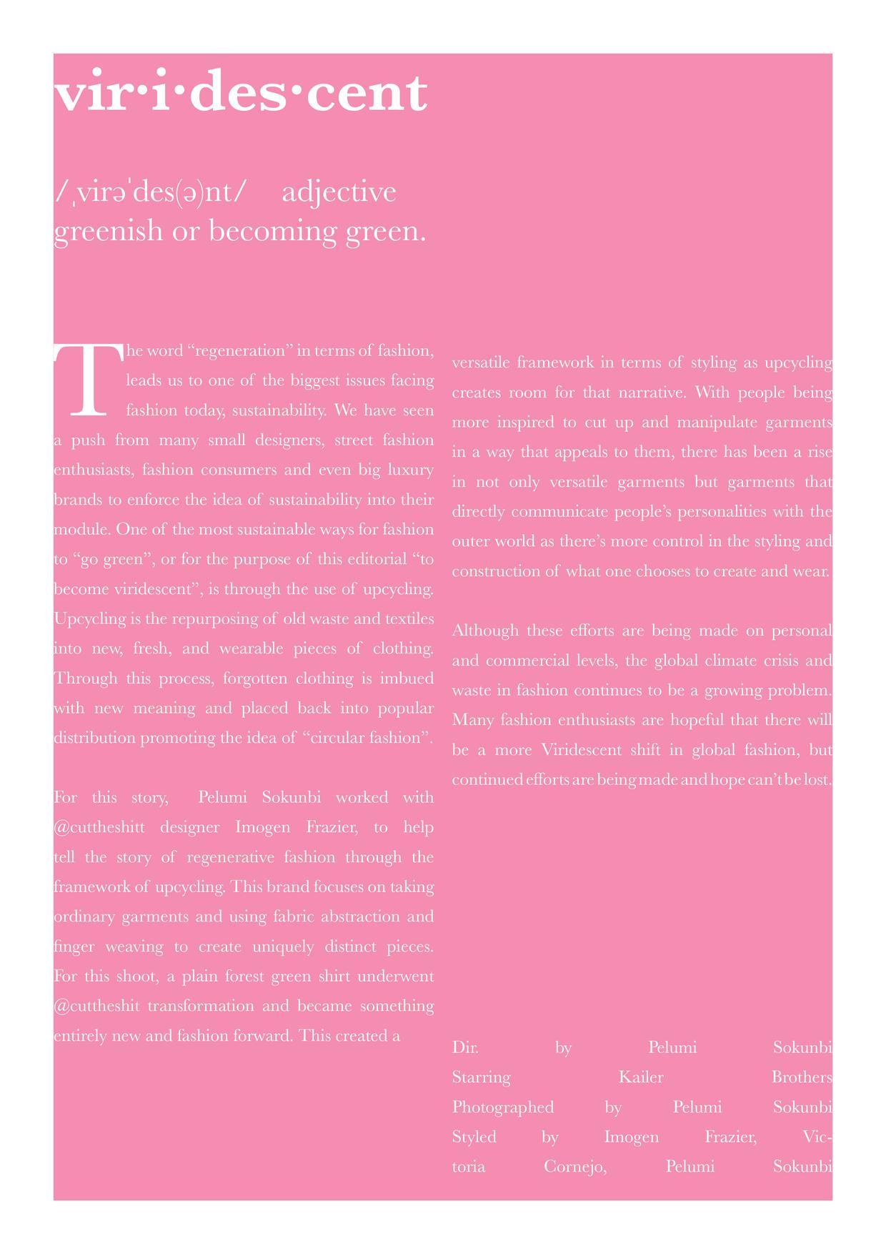 The REGENERATION Edition is Fray Magazine’s fourth issue, and it’s our best one yet This fourth issue has allowed us to regenerate Fray as a concept and incorporate more voices than we ever have before We mended old clothes, saved ourselves and the environment, reformed generations of fashion, and made new and unique choices REGENERATION would not have been possible without the hard work and dedication of our collaborators, team of organizers, and layout editors.