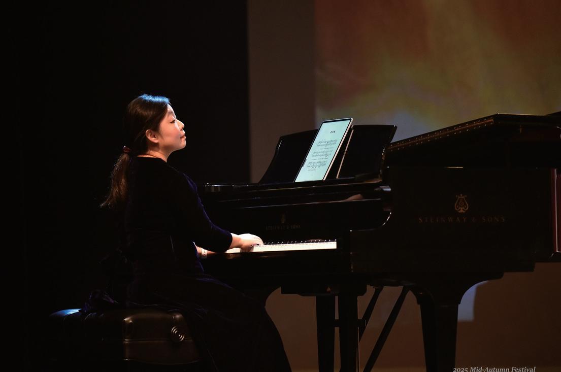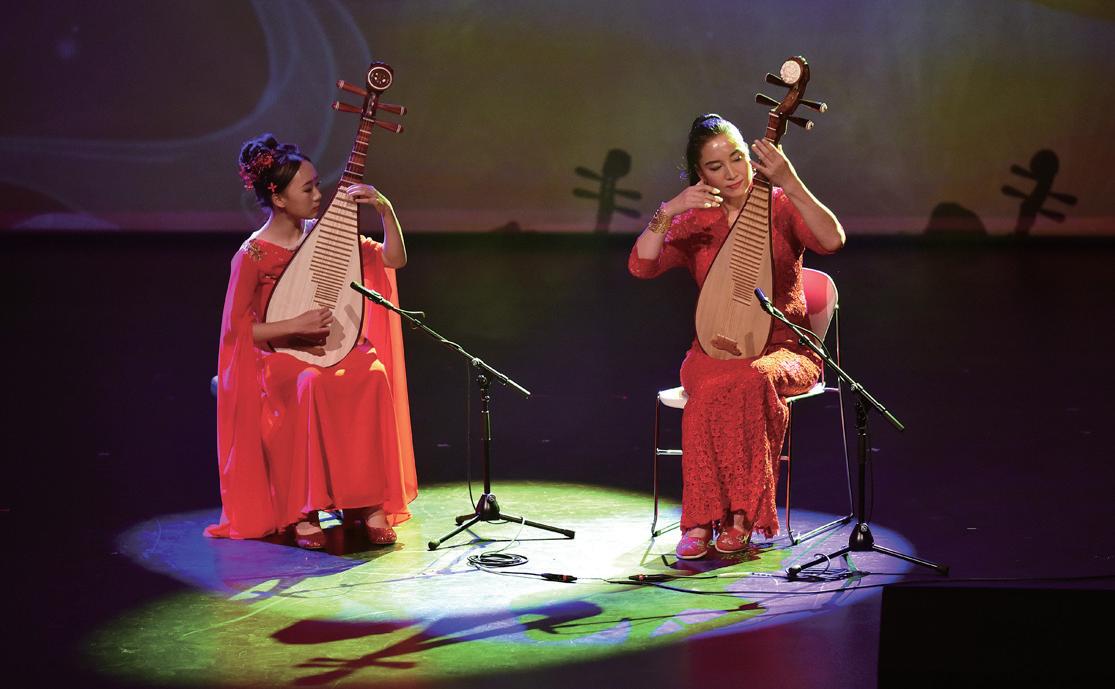 著名琵琶演奏家管亚东与李奕霏携手登台,两把琵琶在舞台中央交 织出如水的旋律。指尖拨动间、音流清澈、情韵悠长,似月华流转 于指尖,古典与思乡在此刻完美交融。乐曲结束,余音缭绕,全场 报以热烈掌声。