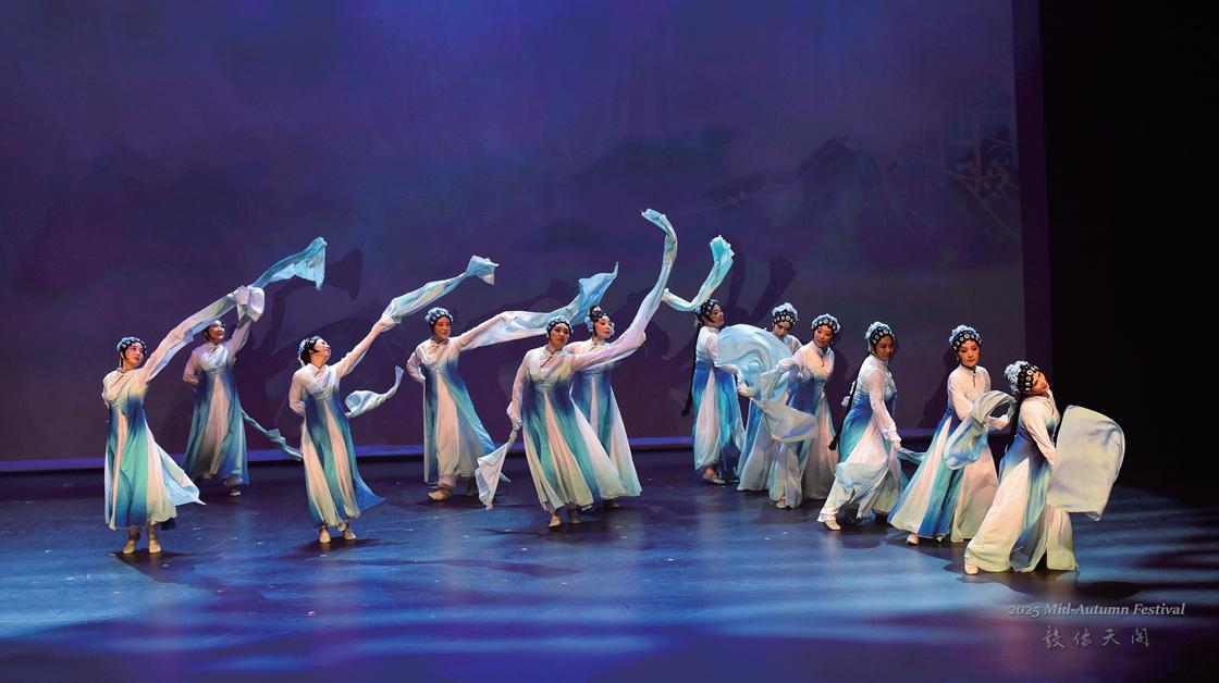 来自 Kitigan Zibi Anishinabeg社区的阿尔冈昆艺术家Awema以浑厚的 鼓点与原始吟唱及舞蹈为晚会开场。节奏震撼、歌声悠远,象征着 生命的力量与希望的延续。现场观众在震撼的声浪中感受到原住民 文化的灵魂与大地的律动,也为整场演出定下了多元与喜庆的基调。 原创国风舞蹈:《登高》