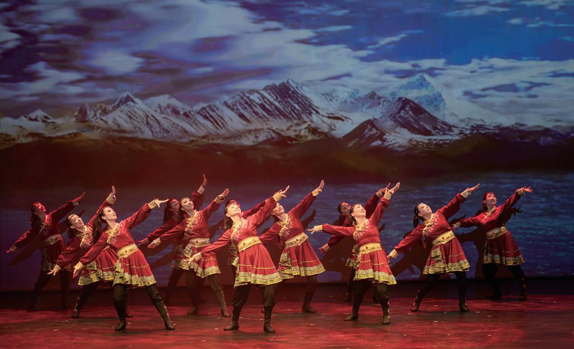 北国歌舞团的舞者以灵动的身姿演绎苗族少女的纯净与柔美。银饰 闪耀,舞步轻盈,犹如山泉流淌。她们用肢体讲述民族的故事,将 观众带入山水之间的浪漫意境。舞蹈的尾声,水姑娘洒出的水珠象 征着祝福与新生,也为晚会上半场演出完美收尾。