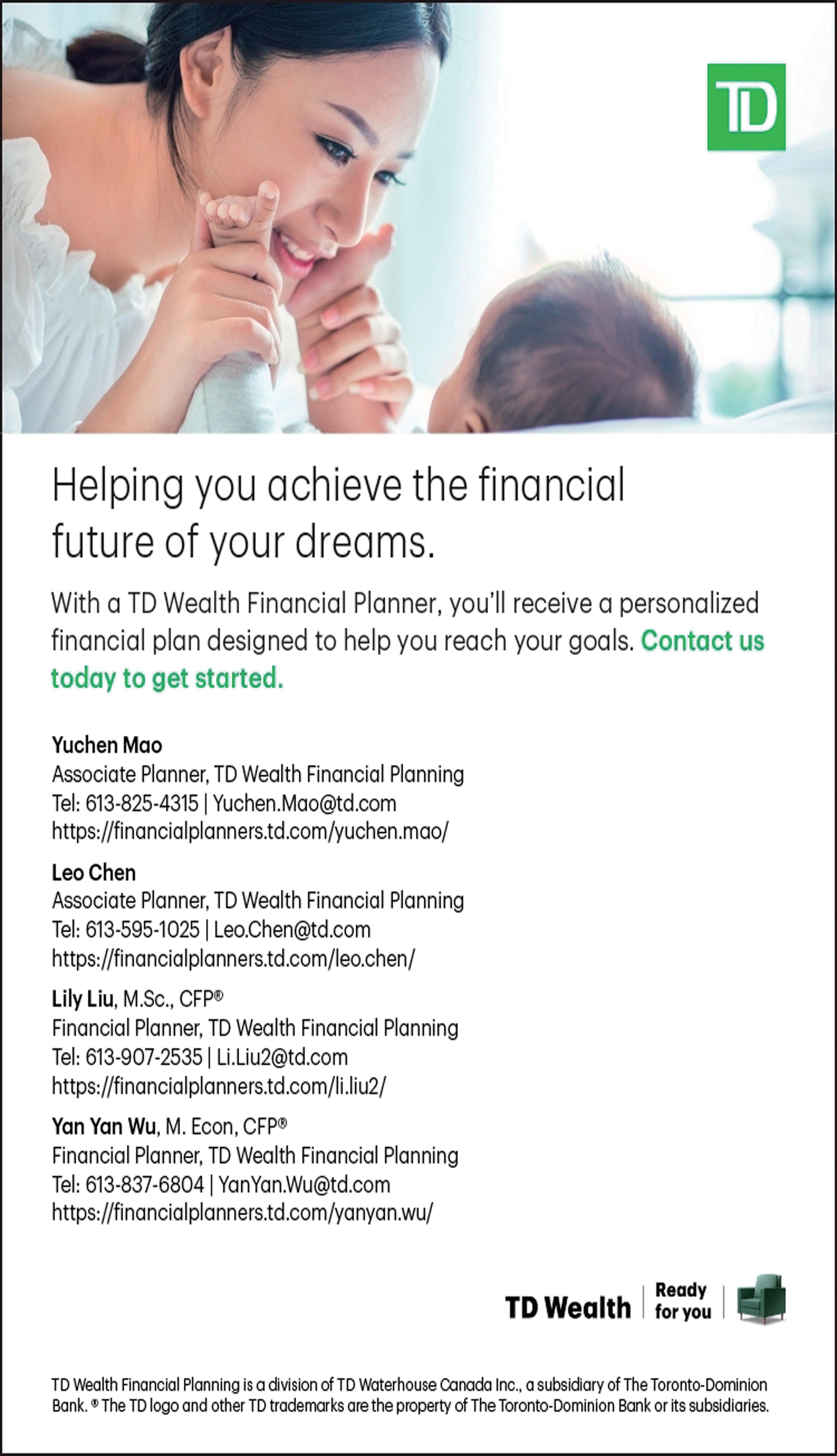 航空航天工程师学士 精诚为您个人、 家庭和公司提供: 投资策略、财务规划 退休规划、财富传承 策划及各种投资、保 险计划等全面金融理 财服务 电话:613-799-3368