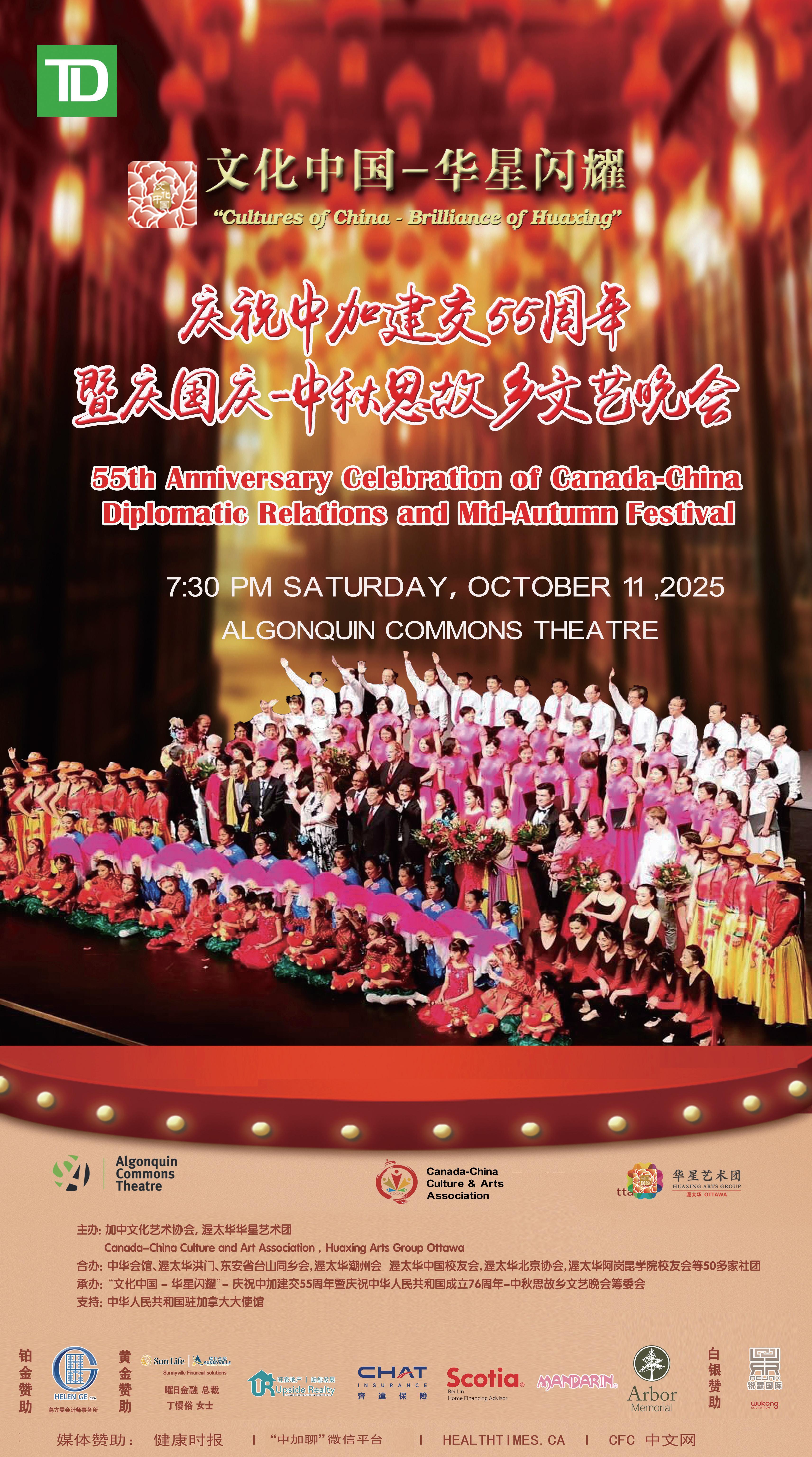 10月11日,渥太华华星艺术团联合渥太华中华会馆、渥太华洪门、 东安省台山同乡会、渥太华潮州会、渥太华中国校友会、渥太华北 京协会、阿岗昆学院校友会等30多家华人社团共同举办“四海同春华星闪耀-庆祝中加建交55周年暨庆祝中华人民共和国成立76周年 -中秋思故乡文艺晚会”。本次晚会的主旨是促进中加民间文化交流、 祝福祖(籍)国繁荣昌盛、寄托海外华人华侨的思乡之情。