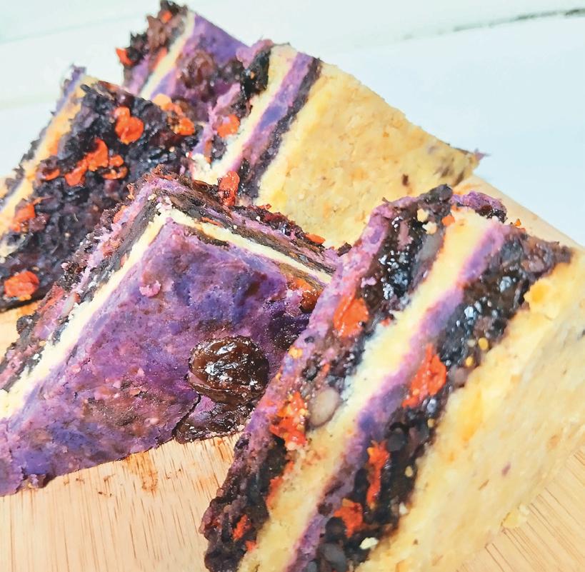 小米、綠豆蒜、薏仁,紅豆、黑米,紫薯或各 式雜糧、甜薯隨意,清洗塵土削皮、濾除雜質後 ,浸泡發脹依黃白、紅黑、紫薯分類炊蒸熟軟壓 成泥,黃白二色趁熱融入少許冰糖勾出香潤,紅 黑則增添適量枸杞綴點豔橘,醇厚紫薯則灑落清 爽微甜葡萄乾,待所有材料稍涼後,取一保鮮盒 依序填裝餡料,層疊抹平鋪延、壓實冷藏定型, 食用時依個人喜好切成適口大小,就能細品其中 香甜繽紛交錯、馥郁芬馨迷人。