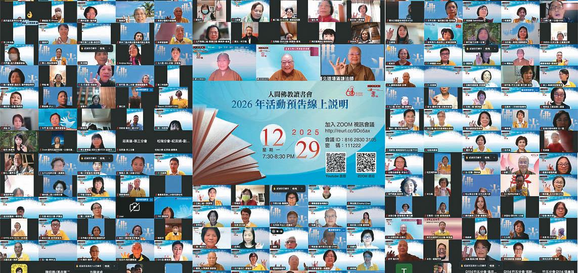 【人間社記者王麒瑋台北報導】人間佛教讀書 會2025年12月29日晚間於Zoom線上舉辦「2026年 活動預告線上說明會」,吸引海內外五大洲愛書 人雲端齊聚,共同掌握2026年度閱讀推動方向。 活動同步YouTube直播,當晚線上參與人數統計 ,Zoom及YouTube平台逾800人參與。