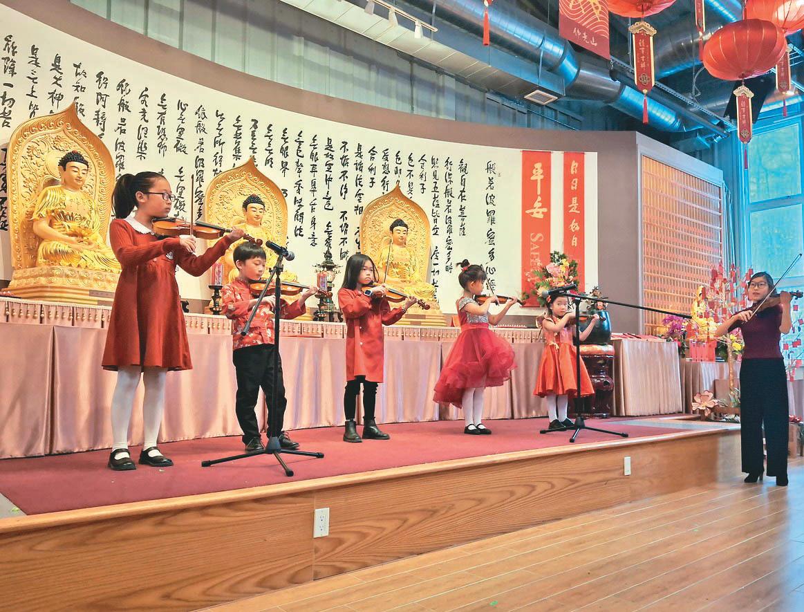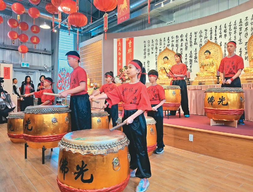 理賀函,感謝各地慶祝春節人士對國家之貢獻; 市議員Wilson Lo亦代讀市長Mark Sutcliffe的賀函, 肯定道場長期推動多元文化與社區和諧的努力。 文化展演在法鼓隊與醒獅團震撼開場中揭幕。 陳天平小提琴班孩童演奏〈小星星變奏曲〉、〈 賽馬〉、〈新年好〉;沈月舞蹈學校帶來古典舞 〈唐宮夜宴〉。三好兒童班以歡快歌聲傳遞祝福 ;17歲的Sabrina Meng專程自紐約返加獻唱花腔女 高音〈春天的芭蕾〉,技驚四座。壓軸由佛光合 唱團演繹〈我願〉與〈希望之光〉。