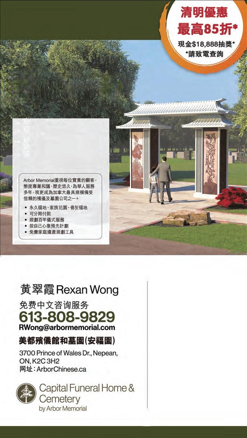 多套物业投资和小企业主,拨打客服热线了解:1.866.392.1088 *利率变动不做另行通知。相关法律声明请查看网页 https://wealthonebankofcanada.com/lang/zh/Personal/Rates/TermDeposits/ 扫码即开户,无需折扣码 2年期 3年期 4年期 5年期 18个月 1年期 5.15% 4.90% 4.90% 4.80% 5.20% 5.25% 增长并保护您的财富 GIC利率高达5.25%* M Y MY CY K 23-1-3- Print ad-143x113.pdf 1 3/4/2023 2:10:42 PM 613.237.2777 1 Colonnade Road at Merivale DOWHONDA.COM 司徒建业 销售代表 Sales and Leasing Consultant KIEN TU (613) 852-3807 Award-winning Honda Customer Service Since 1974 The 2023 Honda HR-V is here! 保温棉团购:政府补贴 每家$1450 - $1850 找渥太华老字号冷暖公司, 一条龙服 务,免费评估! 电话:613-899-2440 传真:613-421-9868 Email:bestenergy2011@hotmail.com 地址:81 Auriga Dr. Nepean, ON. K2E 7Y5 锅炉 & 空调安装和服务 有执照有经验的高质量本地技术员队伍为你服务! 最好的节能冷暖空调公司 夏令营 少年儿童 李健地产经纪人 真诚帮您投资,买卖和打理物业 613-265-3568 613-596-5353 jianli82@gmail.com www.hallmarkottawa.com