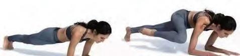 1、平板支撑变体 从肘板支撑开始,然后右腿弯曲膝盖去找右手臂后 侧。保持5次呼吸,换边重复。做10组。