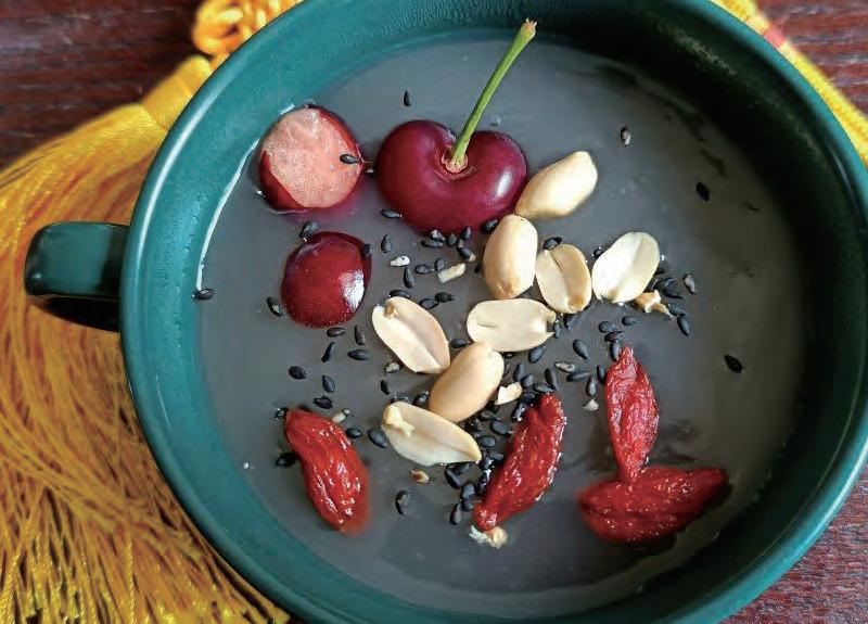 食材明细: 茯苓粉适量、熟花生小许、黑芝麻小许、纯净水 适量、枸杞几个、大樱 桃1个