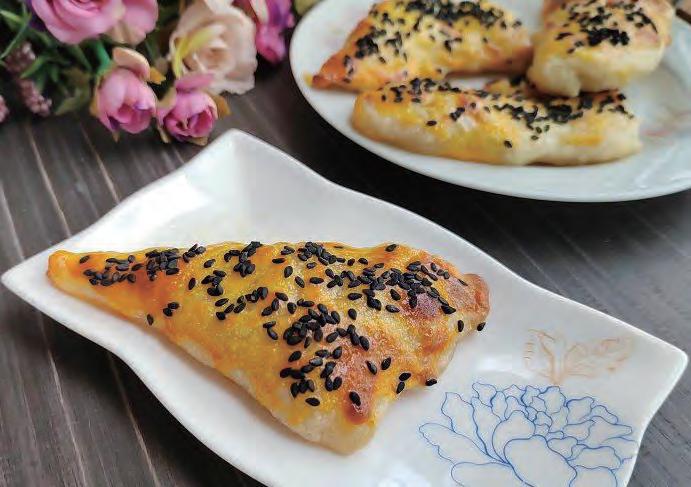 4用手抓饼将馅料包起 来,捏紧收口,用刀在 表面划几条口子,刷一 层薄薄的鸡蛋液,在表 面撒一些黑白芝麻,就 可以入炉烘烤了。