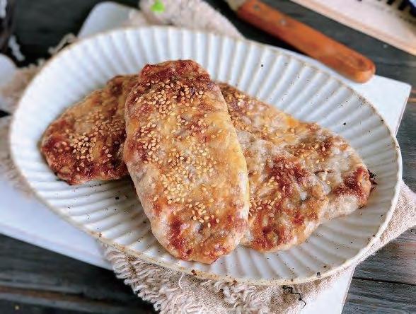 4收口向下放,擀 麺 杖 抹油,轻轻地将饼擀薄, 肉馅若隐若现,表面用 刀划几下,撒白芝麻, 轻轻按实。