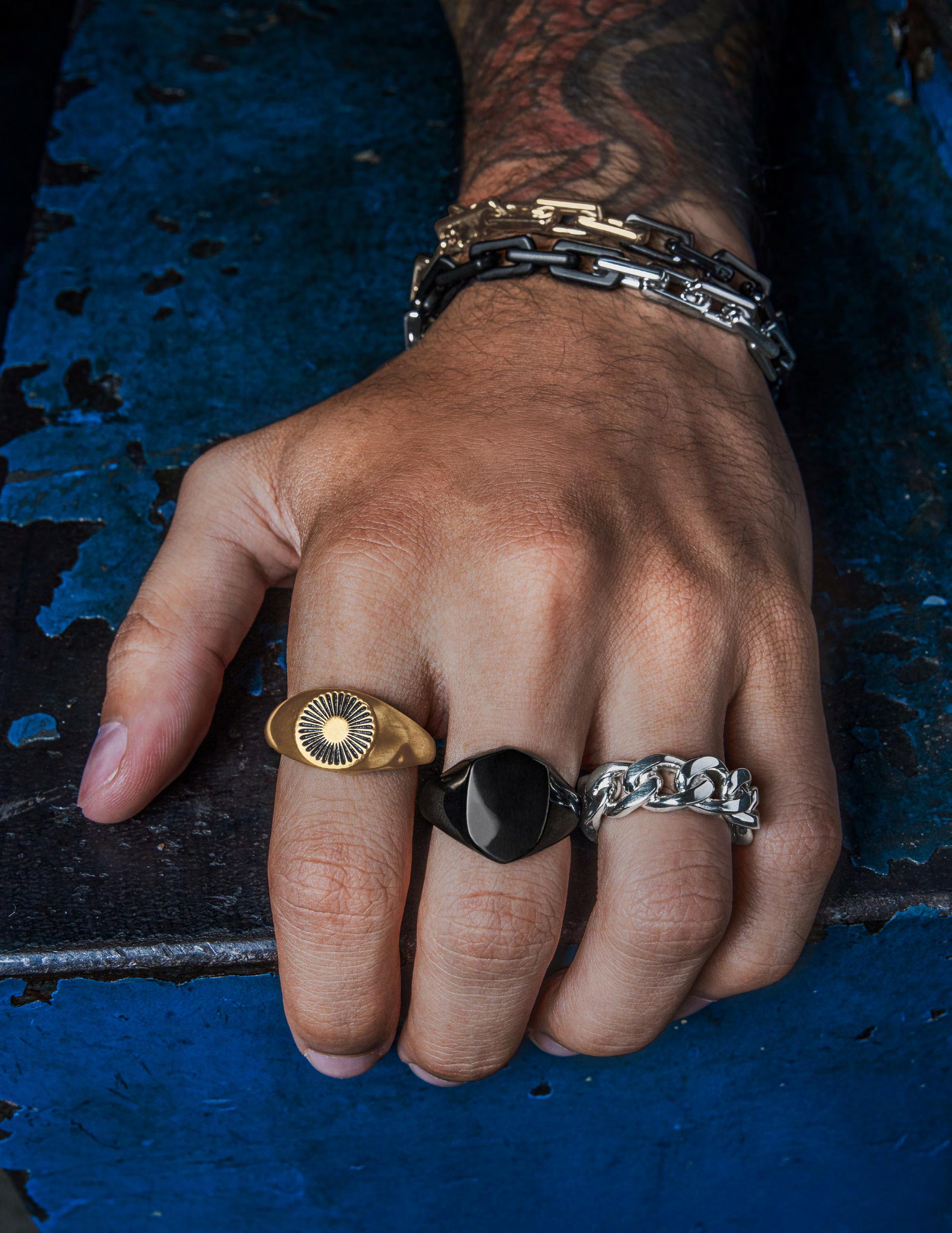 Bold rings crafted in sterling silver, matte titanium, and black PVD combine rugged textures, modern silhouettes, and precise pavé settings. With unique details including shields, curb links, Ceram8 ceramic, lab-created diamonds, and bezel-set onyx, these pieces offer stylish comfort, durability, and standout confidence—perfect for daily wear or sophisticated self-expression.