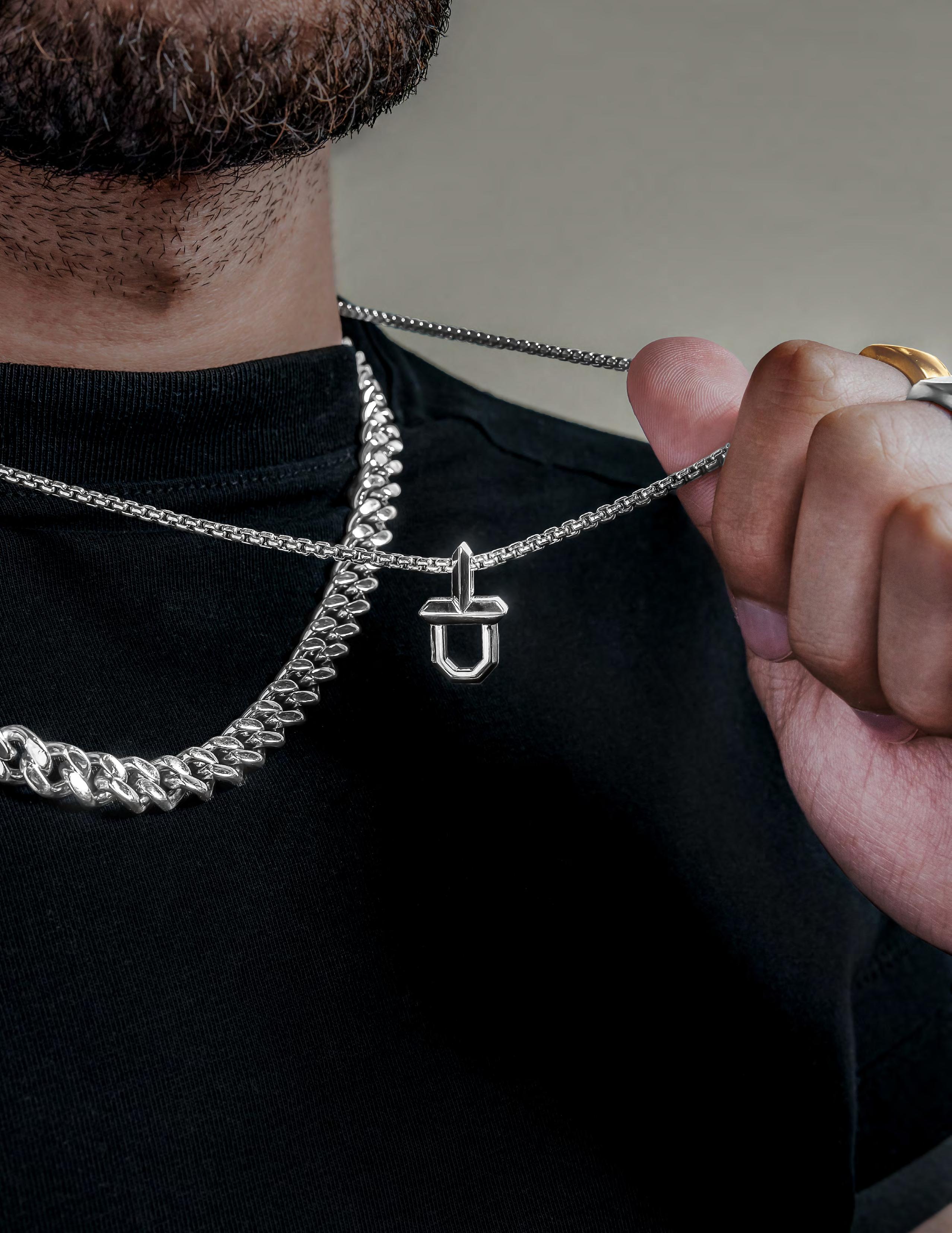 Bold yet refined necklaces and pendants in polished sterling silver, black ruthenium, Ceram8 ceramic, and gold accents feature iconic symbols like shields, feathers, and compasses. Designed for confident layering or standout solo wear, these statement pieces blend durable craftsmanship with versatile style, ideal for daily expression and powerful masculine aesthetics. Available in 22” and 24” chain lengths with iconic Triton clasps.