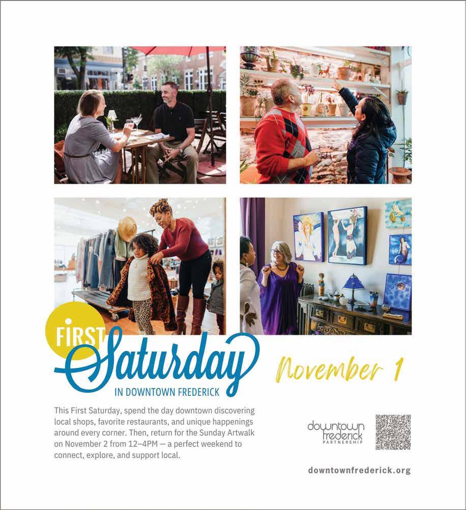 First Saturday — in downtown Frederick. Downtown businesses celebrate First Saturday with their own unique events. From instore tastings and gallery openings, to artist and vendor exhibitions … there’s always something new to explore! downtownfrederick.org/events.