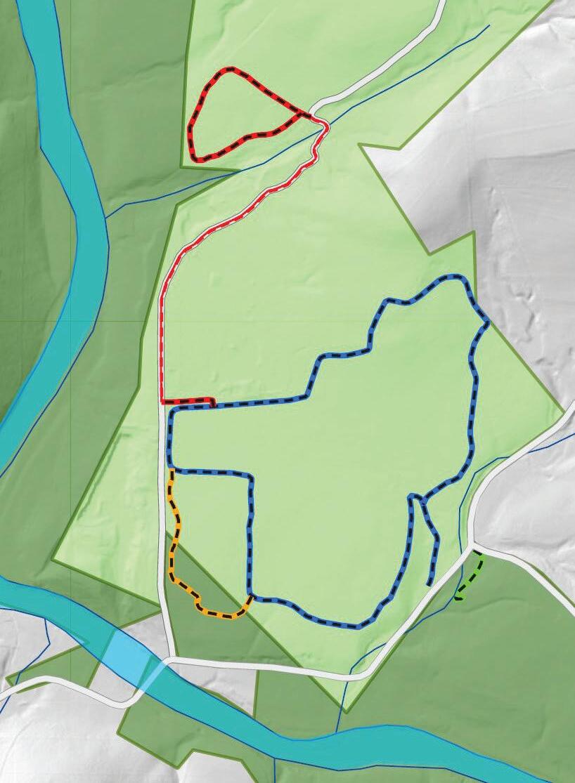 Trails: The 4.5 mile Lonacona Loop was constructed in 2023 and provides users with a moderately challenging experience gaining 650 feet of elevation over rocky terrain. The Dye School Trail connects with the Lonacona Loop to create a one mile loop option that gains only 200 feet of elevation and features the foundation of the Dye School, a one-room schoolhouse active in the late 1800’s and early 1900’s.