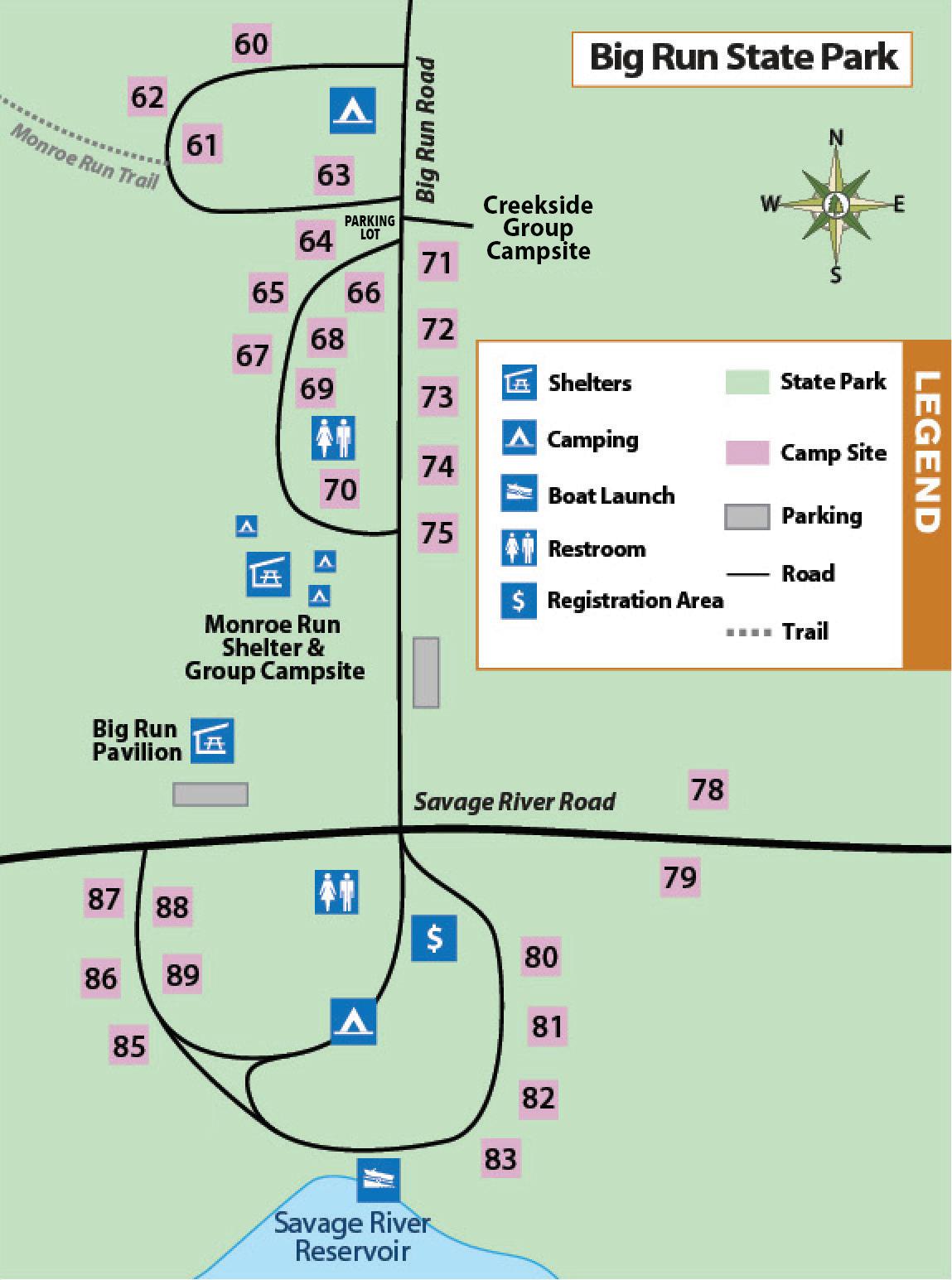 Big Run also offers two group camping areas and a large picnic pavilion for day-time use. To reserve a campsite or pavilion, call 1-888-432-CAMP or visit park reservations.maryland.gov. Reservations are strongly encouraged, but walk-in camping for one night only can be accommodated at the self-registration area.