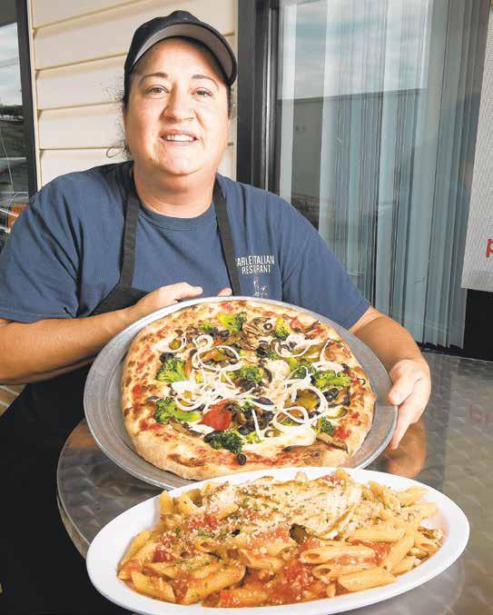 Carleo Italian Restaurant owner April Martin holds up an all veggie pizza and pasta dish inside the Emmitsburg pizza shop.