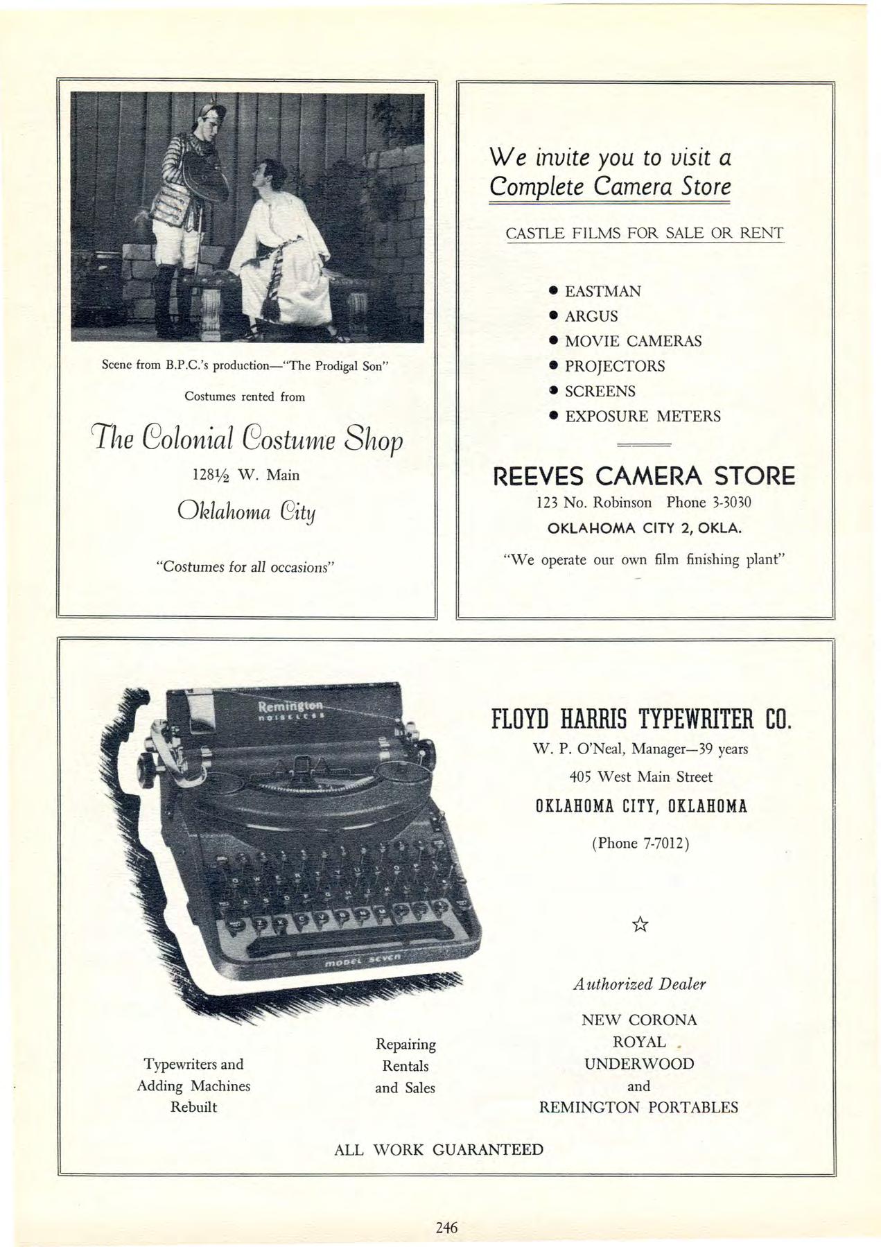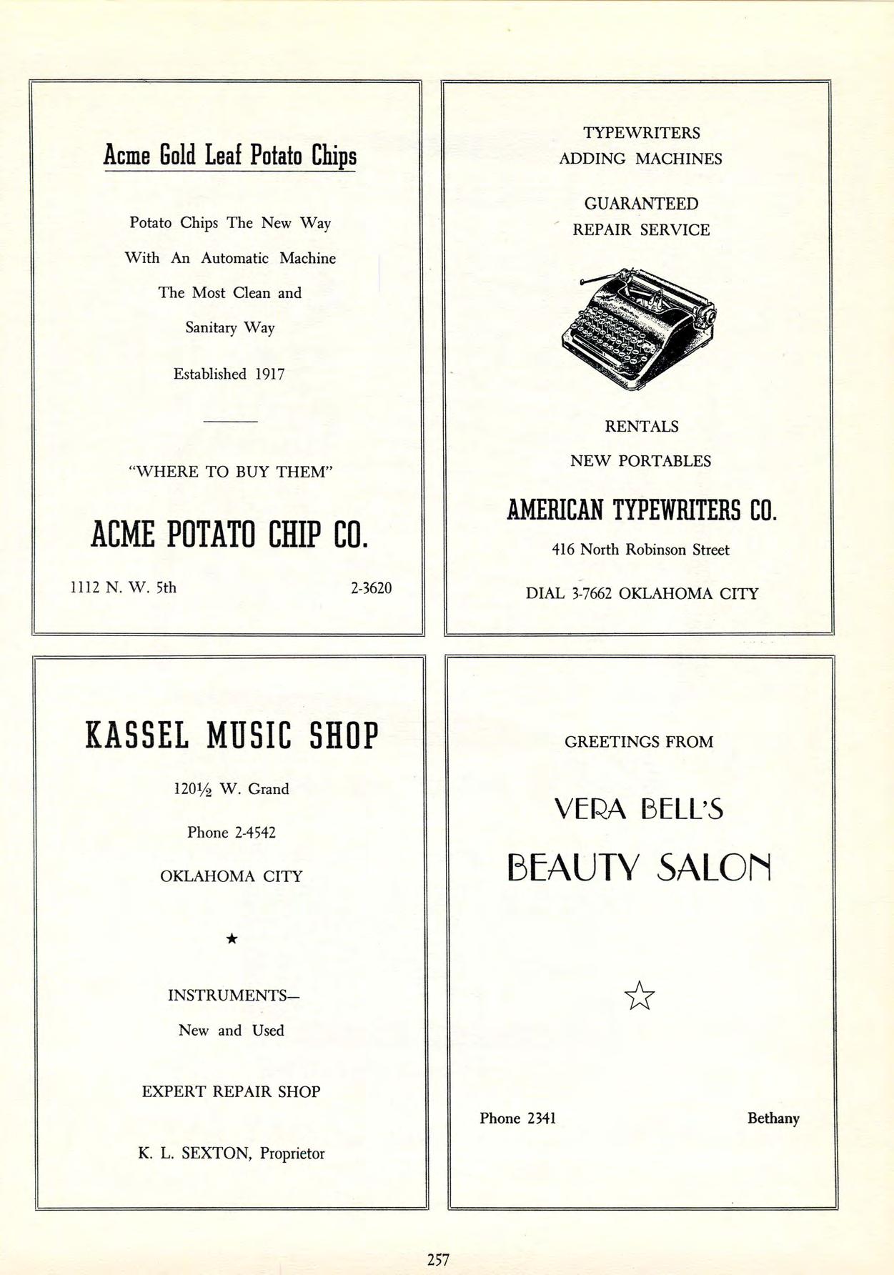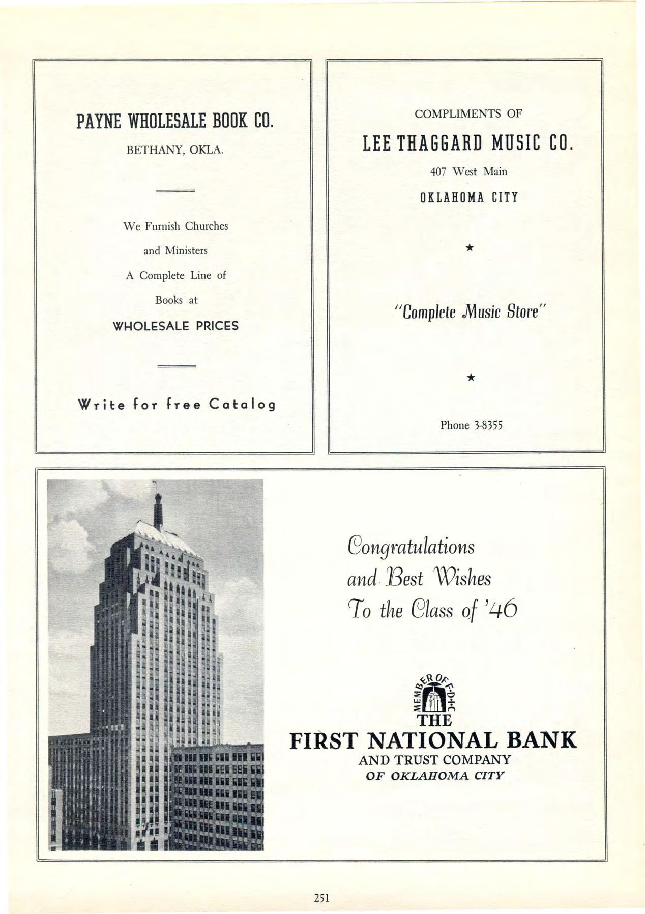 Ka ssei Mu sic Shop _ 25 7 Kiwani s Intern ation al __ ..:2 55 Kn ight' s Grill _ 27 3 Lavalon Beauty Salon ____ 272 Lee Thaggard M usic Co __ 25 1 Leo nhardt Lumber Co. _ 262 Liber ty C afe _ 253 Lib erty Na tion al Bank _ 249 Lunsford 's Servi ce Stati on __ 256 Mexihot, Th e ___ 243 Nash Finch C o. _ 260 Oklahom a Natural G as Co ___ 244 Owen ' s Furniture ___ 271 Pa ul Stewa rt ' Mu sic C enter ________ 2 55 Payne Wholesale Book Co. __ 251 Reeves C amera Store _______ 246 R eveille Echo ______ z7 4 Smith th e Pen Man ________ 260 Street and Smith _ 249 Trav e-Ta ylor Co ___ 250 Up -To-D at e Cleaners __ 24 7 Vera Bell ' s Beaut y Salon ____ 25 7 Wehrenb erg Pharm acy _ 254 ALUMNI DIRECTORY __ 225 ATHLETICS-BOYS ' Basketball ___ 114-118 Softball _____ 110-112 T enn is 119 Track - - - 120 W arriors - - - - 121 ATHLETICS-GIRLS' Basketball Softball ___ 122 -124 Squaws - - - - - - - - 121 Tennis - - - - - 125 Track - - 129 CLASS ES Freshm an - - - - - - - - 41-5 7 Junior - - - - - 68-7 4 Second Semester _87-93 Senior - - - - 7 5-83 Sophomore - 58- 67 Special _____ 84- 87 CULTURE A Cappella Choir ______ 19 8-1 99 Arrow Staff ___ 20 8-209 Band - - - - - - 200 Debate - - - 205 Echo Staff _ 210-211 Fine Arts Department __ 19 7 Jun ior Class Pla y _ 206 Orchestra - - - 201 Phi Delta Lambda __ ..: 20 7 Quartets & Trios _____ 202-203 Speech Department - 204 Treble Choir __ i 9 8- 199 DEDICATION _ 2-3 FALL DAZE All-School Party _ 136 Class outings - - - - - 139 Clean-up day - - 13 7 Dorm life - - - - - - - 138 Frosh reception __ 13 3 11\itiation - - - - - - - - 134-135 Jamboree __ :_ _ 140-141 Registration - 132 RELIGION Chapel speakers __ 174-175 Church auxiliaries - - - - - - - - - - - -17 3 Church visitor - - 181 College Church - - - - - 1.7 1 322 Go spel Team - - - 177 Mi ss ion ary Band 178 Pra yer and Fa sting Leagu e - - - 176 Student pastors - - - 179 Sunda y School __________ 172 Sunda y School t eacher s _ _ 179 SERVICEMEN _ 8-9 SPRING LIFE Commencement - - - 222 -223 Drag, The _ 21 8- 219 Fres hm an Banquet _ 229 Jun ior-Senior Banquet ___ 2 14- 215 Sophomore Banquet 221 Work Students _ ____ 216- 217 SUMMER ACTIVITIES Commencement - - - - - - 105 Faculty - - - - 98 Improvements · _ 100-101 New Dorm Unit _ 102-103 Registration - - - - - - - 96 Religious acti vities - - - - - - 10 4 Social events - - - 9 7 Sports - - - - - - 99 WHO ' S WHO - - - - 16 7 WINTER GRIND Alumni Team - 18 5 Board of Trustees - - - - - - - - 185 Christma s Choru s - - - - 184 Commercial Department Home Economics Department __ 188-189 Library, The __ .:_ ________ 186-18 7 Movin g D ay - - - - - - 184 Science Department _ 190-191 700th Registrant __ 184