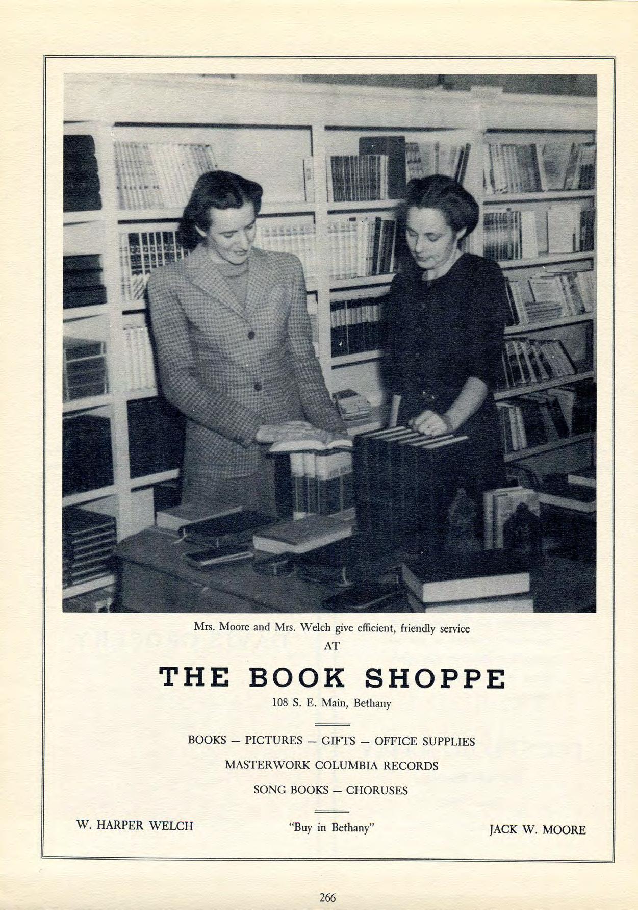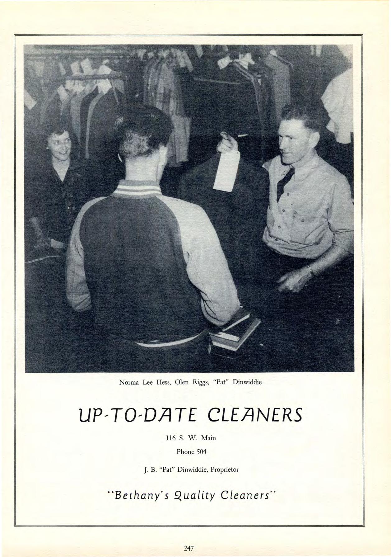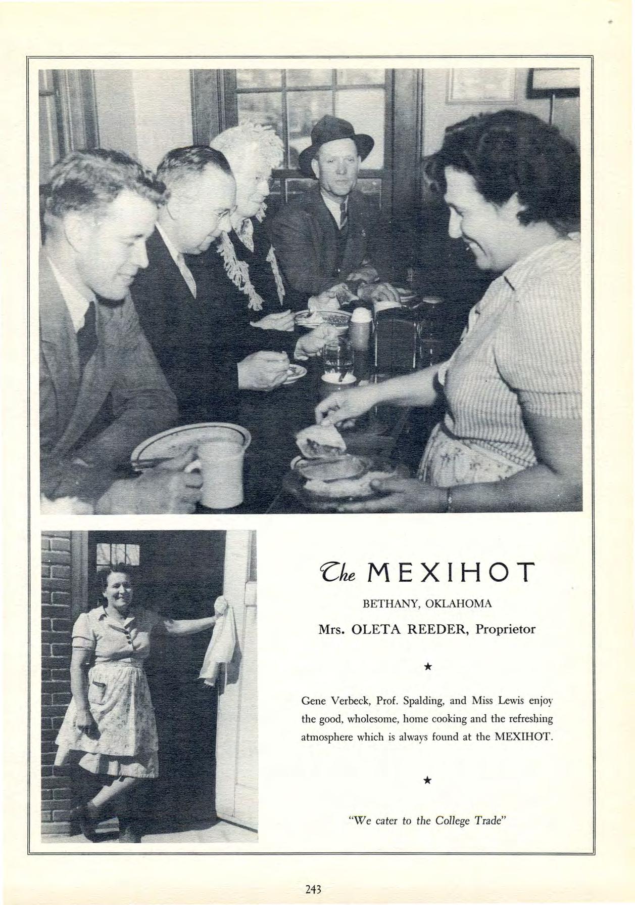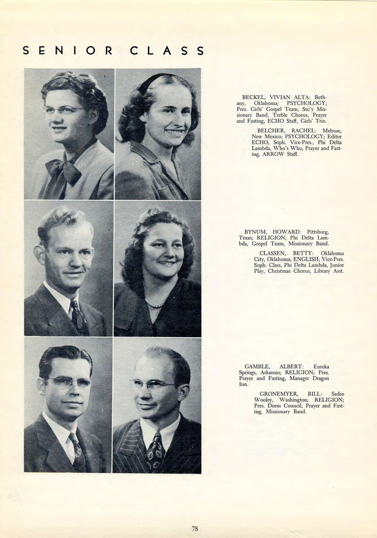 Ka ssei Mu sic Shop _ 25 7 Kiwani s Intern ation al __ ..:2 55 Kn ight' s Grill _ 27 3 Lavalon Beauty Salon ____ 272 Lee Thaggard M usic Co __ 25 1 Leo nhardt Lumber Co. _ 262 Liber ty C afe _ 253 Lib erty Na tion al Bank _ 249 Lunsford 's Servi ce Stati on __ 256 Mexihot, Th e ___ 243 Nash Finch C o. _ 260 Oklahom a Natural G as Co ___ 244 Owen ' s Furniture ___ 271 Pa ul Stewa rt ' Mu sic C enter ________ 2 55 Payne Wholesale Book Co. __ 251 Reeves C amera Store _______ 246 R eveille Echo ______ z7 4 Smith th e Pen Man ________ 260 Street and Smith _ 249 Trav e-Ta ylor Co ___ 250 Up -To-D at e Cleaners __ 24 7 Vera Bell ' s Beaut y Salon ____ 25 7 Wehrenb erg Pharm acy _ 254 ALUMNI DIRECTORY __ 225 ATHLETICS-BOYS ' Basketball ___ 114-118 Softball _____ 110-112 T enn is 119 Track - - - 120 W arriors - - - - 121 ATHLETICS-GIRLS' Basketball Softball ___ 122 -124 Squaws - - - - - - - - 121 Tennis - - - - - 125 Track - - 129 CLASS ES Freshm an - - - - - - - - 41-5 7 Junior - - - - - 68-7 4 Second Semester _87-93 Senior - - - - 7 5-83 Sophomore - 58- 67 Special _____ 84- 87 CULTURE A Cappella Choir ______ 19 8-1 99 Arrow Staff ___ 20 8-209 Band - - - - - - 200 Debate - - - 205 Echo Staff _ 210-211 Fine Arts Department __ 19 7 Jun ior Class Pla y _ 206 Orchestra - - - 201 Phi Delta Lambda __ ..: 20 7 Quartets & Trios _____ 202-203 Speech Department - 204 Treble Choir __ i 9 8- 199 DEDICATION _ 2-3 FALL DAZE All-School Party _ 136 Class outings - - - - - 139 Clean-up day - - 13 7 Dorm life - - - - - - - 138 Frosh reception __ 13 3 11\itiation - - - - - - - - 134-135 Jamboree __ :_ _ 140-141 Registration - 132 RELIGION Chapel speakers __ 174-175 Church auxiliaries - - - - - - - - - - - -17 3 Church visitor - - 181 College Church - - - - - 1.7 1 322 Go spel Team - - - 177 Mi ss ion ary Band 178 Pra yer and Fa sting Leagu e - - - 176 Student pastors - - - 179 Sunda y School __________ 172 Sunda y School t eacher s _ _ 179 SERVICEMEN _ 8-9 SPRING LIFE Commencement - - - 222 -223 Drag, The _ 21 8- 219 Fres hm an Banquet _ 229 Jun ior-Senior Banquet ___ 2 14- 215 Sophomore Banquet 221 Work Students _ ____ 216- 217 SUMMER ACTIVITIES Commencement - - - - - - 105 Faculty - - - - 98 Improvements · _ 100-101 New Dorm Unit _ 102-103 Registration - - - - - - - 96 Religious acti vities - - - - - - 10 4 Social events - - - 9 7 Sports - - - - - - 99 WHO ' S WHO - - - - 16 7 WINTER GRIND Alumni Team - 18 5 Board of Trustees - - - - - - - - 185 Christma s Choru s - - - - 184 Commercial Department Home Economics Department __ 188-189 Library, The __ .:_ ________ 186-18 7 Movin g D ay - - - - - - 184 Science Department _ 190-191 700th Registrant __ 184
