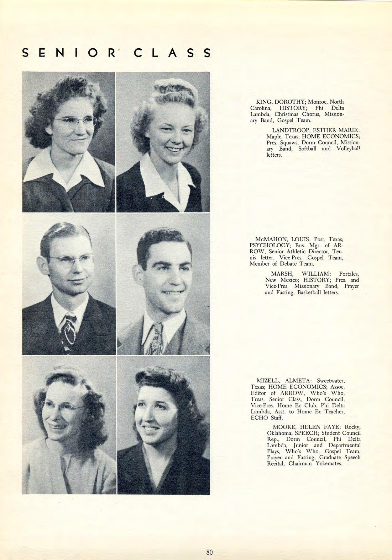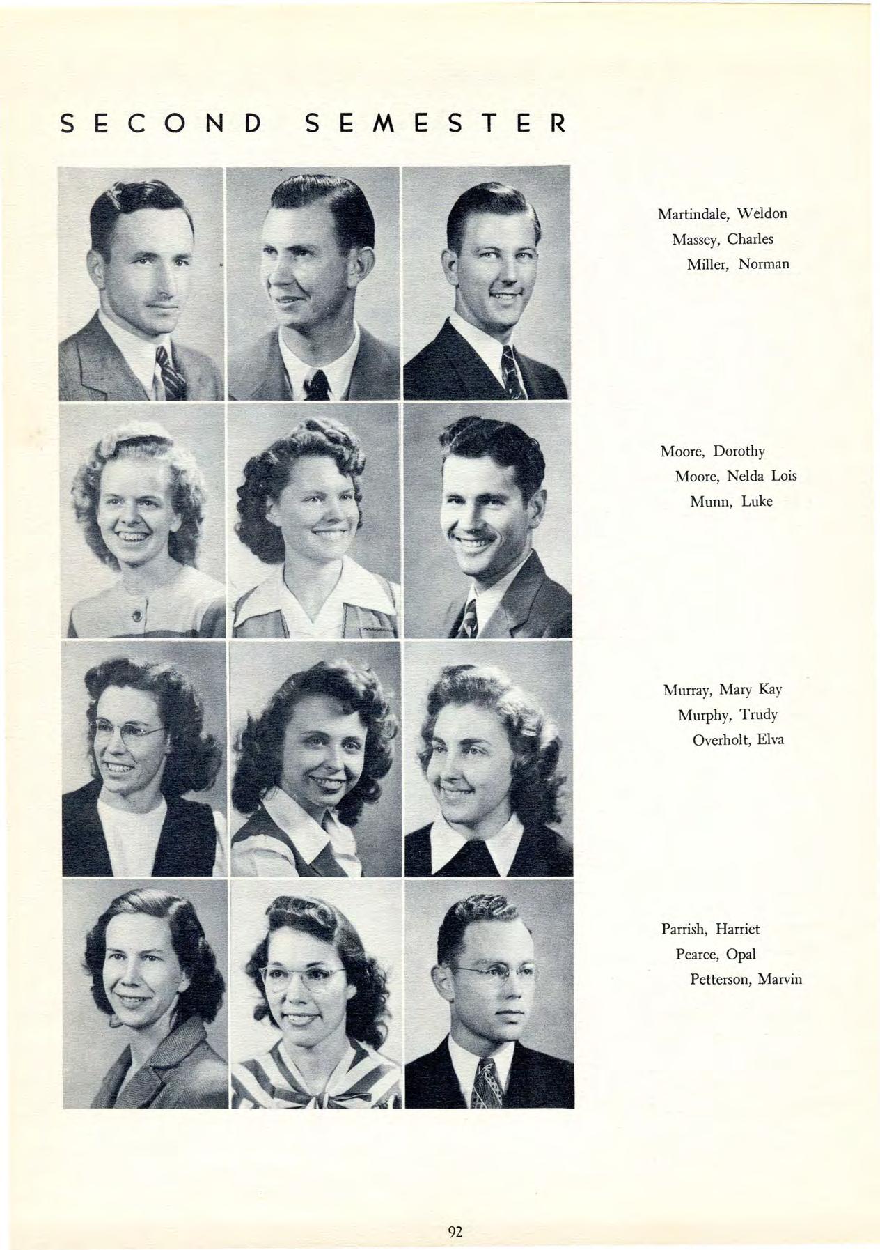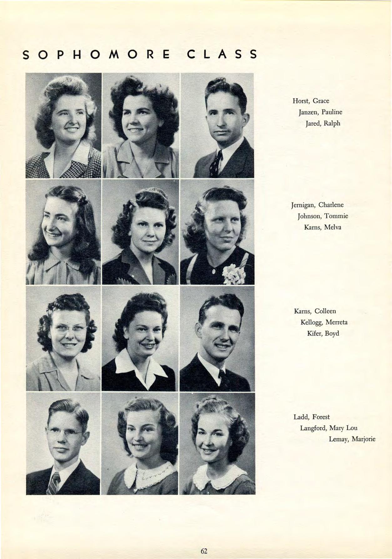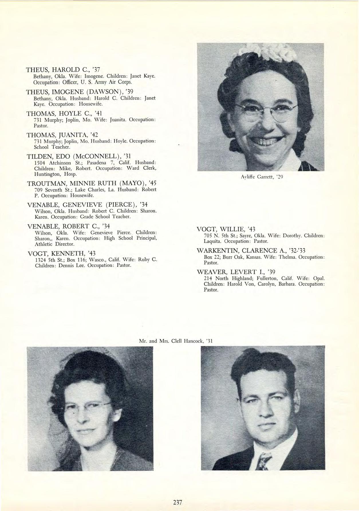 Kent, Arlene (F) ______ 50, 96, 132, 176, 177, 178 Kerr, Lee Dona (Jr) ______ 7l, 132, 137, 253, 273 Kifer, Boyd (So) ______ 62, 97, Ill, 135, 176, 177, 178, 200, 202, 217 King, Dorothy (Sr) ______ 33, 80, 176, 177, 178, 186, 207, 222 King, Wilbur (F) ________ 50 Knippers, Douglas (F) ________________ 50 -LLadd, Forrest (Jr) ______ 62, 176, 177, 178, 207 La Due, Eldreth (Sp) __________ 200, 201 La Due, Elmer (Sp) _____ 200, 201 Lambert, Terry (F) __________ 56, 137 Lampp, Sue (F) _ 56, 123, 176, 188, 199 Land, Herbert -(Sp) _______ 86, 100 Landtroop, Esther Marie (Sr) ___ 80, 121, 123, 124, 127, 128, 138, 178 Langford, Mary Lou (So)-----.-33, 62, 122, 137, 189, 219 Largo, James (F) -----------------9, 90 Lawrence, Truman (F) _9, 90 Ledbetter, Ada ( F) __________________ 90 Ledbetter, Stanley (F) ______ 50, 111, 112 Ledbetter, Vernon (F) __ 9, 91, 179, 180 Lee, Jack (F)-------------------- 9 , 91 Lee, Pauline (F) _____________ 50, 177, 199 Lee, Ouida (F)---------------------- 91 Lemay, Marjorie (So) _ 62 Lemmons, Roy (F)---------------- 9, 9i Lewis, Orlene (F) _________ 50 ; 193 Lindaberry, Aleen (F) ________________ 91 Lindley, Beulah (F) ____ 50, 176, 177, 178, 199, 203, 218 Little, Glenn (F) ______ 9, 50 , 105 , 112 , 11 7, 118, 140, 141, 271 Little, Helen (F)--------------------- 91 Little, Margaret (F) __________________ 50 Locke, Jerald (Sp) ________________ 84, 86 Locke, Thelma ( Sp) __________________ 86 Loughmiller, Lawana (F) ____ 41 , 50 Loughridge, Bill (F) ________________ 9 , 91 Lucas, Charles (So) _______ 63, 193, 200 Lucas, Mary Jane · (So) ______ 63, 126, 199 Lunn, Alma Jean (Jr) __ 72 , 121 , 123, 127, 128, 134, 137, 210 Lunn, Mervel (Jr) ______ 50 , 199, 208 , 211, 219 Luther, Aline (F) ________________ 51, 176 Lynch, Pauline (F) - 51 Lynch, Ruby (So) _ 63 Lynch, W M (F) _________________ 9, 91 Lynch, Betty (Sp) _______ 217 Lynn, Audie (F) ______ 51, 123, 133, 134, 176, 199 -MMcArthur, Glenn (So) ___ 63, 104, 111, 113, 114, 116, 118, 121, 140, 141, 176, 177, 178 , 199 McCall, Charles (F) _________ 51, 176, 177 McCollom, Russel (F) _______ 51, 134, 176, 178, 220 McGill , Bill (Jr) ___ 9, 72, 200, 201, 207 McGill, Charlotte (Jr)------72, 96; 121 , 123, 125, 127, 128 McMahon, Louis (Sr) __ 80,97, 99, ll2, 119, 176, 177, 179, 282, 209 McMahon, Ruth (So) ________________ 63 McNair, Betty (So) __________________ 63 McWilliams, Leila Mae (F) _______ 51, 200 Maurice (Jr) - - - 72, 141 Makes Cry, Albert (Jr) _____________ 9 , 91 Manners, Betty Lou (F) __ 51, 216 Mansveld, Wilbur (So)------ - 9 Marsh, Archie (F) __ 51, 111, 117, 216 Marsh , Willie (Sr) ______ 80, 110, 118 , 178, 180 , 222, 261 Martin, Grace Corrine (F)-------- - 91 Martin, Tomie (F)---------------- 9, 91 Martindale, Weldon (So)-----------9, 92 Massey, Charles (Sp) ---------------9, 92 Masters, Tera Jane (F) ___ 51, 123, 124, 12 7, 176, 199 Maxwell, Leatrice (Sp) ___________ 86 Meador, Douglas (Sp) ______ 51, 111, 117, 120, 137, 184 Messer , Rubena (So) _________ 63 , 136, 176 Milburn, Charles (Sp) _________________ 9 Miller, Norman ·(So) __________ 9, 92, 267 Mizell, Almeta (Sr) ____ 75, 80, 136, 164, 207, 209, 223, 269 Mizell, Dale Marie (F) ______.51 , 133, 137 Mizell , Jackie (So) _______________ 63, 208 Moffatt, Marion (F) _________________ 51 Moore, Betty (F) ____ 52 Moore, Charlene (F) ________ 52 , 123, 211 Moore , Dorothy (Sp) -------------92, 216 Moore, George (Jr) ______ 33 , 72, 136, 199, 206, 207 Moore, Heleo Faye (Sr) ______ 33, 36, 75, 80, 148, 173, 176, 179, 204 , 207 Moore, Nelda Lois (F) ________________ 92 Moore, Virginia ( Sr) ______ 33 , 75, 81, 134, 199, 211 Mosshart, Jean (F) __ 52, 176, 177, 178 Munn , Luke (F) _9, 92 Murphy, Trudy (F) ______________ 92 , 208 Murphy, Louise (So) ___ 63, 177, 178, 201, 207 Murra y, Mary Katherine (Sp ) __________ 92 -NNagel, Mildred (F) ______________ 52, 248 Nash, Betty (F}-------------52, 134,199 Neufeld, Beulah (So) ________________ 63 Neufeld, Flo yd (Sr) __ 81 Newberry, Aaron (So)---------------- 9 Newcomb, Donald (F) - - 9 Nichols, Kenneth (F) ___ 52, 100 Normandin, Marjorie (So) _____________ 6 3 Norris, Darlene (F) ______ 33, 52, 176, 177, 199 Northcutt, Claude (Jr) ______ 72 Northcutt, Lillian (Sp) _ 86 Nye, Juanita (F) ______ 52 , 133, 176, 177, 178, 201 N ye, Monteen (Jr) ___________________ 64 Nye, Bob (Sp) ___ :._ _____ 63 , 111 , 253 326 -0Oakes, Loretta (So) ____ 33 , 64, 135, 176, 177, 178, 217 O'Donley, Joann (F) _____ 52 , 176, 273 Ohsfeldt, Grace (F) _________ 52 , 180, 201 Overholt, Elva Ellen (So)--- 92 - PPace, Eunice Jo (F) __________________ 52 Parham, Ruth (Jr ) ______ 72, 176, 190, 199 Parrish, Harriet (Sp ) __________________ 92 Parrish, Milton (So) ______ 9, 64, Ill, 118, 121, 220 Parrish, Herman ( Sr) ______ 8l, 110, 118, 191 Patterson, John (Jr) _______ 72 Patton, B A. (So) ______ 52 , 96, 178 , 199 , 217 Pa yne, Effie Marie (So) __ 64 Pearce, Opal (F) 92 Perdue, Beulah (F) ____________ ,.._ 53, 133 Peterson, Marvin (So) _9, 92 , 117, 120 Phelps, Paul ( Sp ) 9 Phelps, Virgil (Sp) --------------------9 Phillips , Goldie (Sp) ______ l05 , 176, 177, 178 , 179 , 180 Phillips, Olena ___ 29 3 Phillips, Virginia ( F) ___________ 53 , 96 Pigg, Joyce (Jr ) _72, 139 Plemons, Eugene ( F) _____ 53 , 111, 113, 199 Pollard, Ken (F) _______________ 9, 93 Porter, Bill (F) ______ 53 , 176 , 177, 178, 180 Porter, Birdie (So) ______ 64, 176, 177, 178 Potter, Lorraine (So) _______ 64, 176, 177 Price, Kenneth ( So) _________________ 64 Pults, Clester ( Sr ) ______ 81, IIO , 154, 176, 177, 179 , 198, 217 Pults, Ora Lee (So) __ 65, 176, 177, 264 Purgason, Jean (Jr ) ______ 72, 123 , 199, 201 -RRainbolt , Calvin (So) __ 64, 111 , ll6 , 18 7, 190, 201 Ratcliffe, Pearl ( Sr ) _ _____________ 81, 222 Raymer , Ida Beth ( F) ______ 53, 176, 17 7, 189, 200 Reed, Sybil Rae (F) _ 53, 12 7 Reed , Velma ( So )- - ----33, 64, 122 , 124, 126, 129, 141 , 176 Reep, Kathleen (F) __ 53 Reeves, Lois (Jr) ----------------72, 192 Reneau, Irene (J r) _____ 72, 189 Rhode