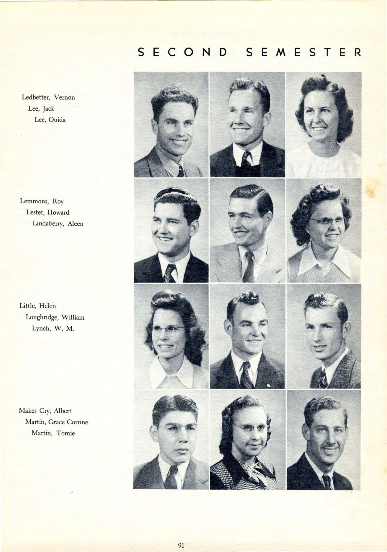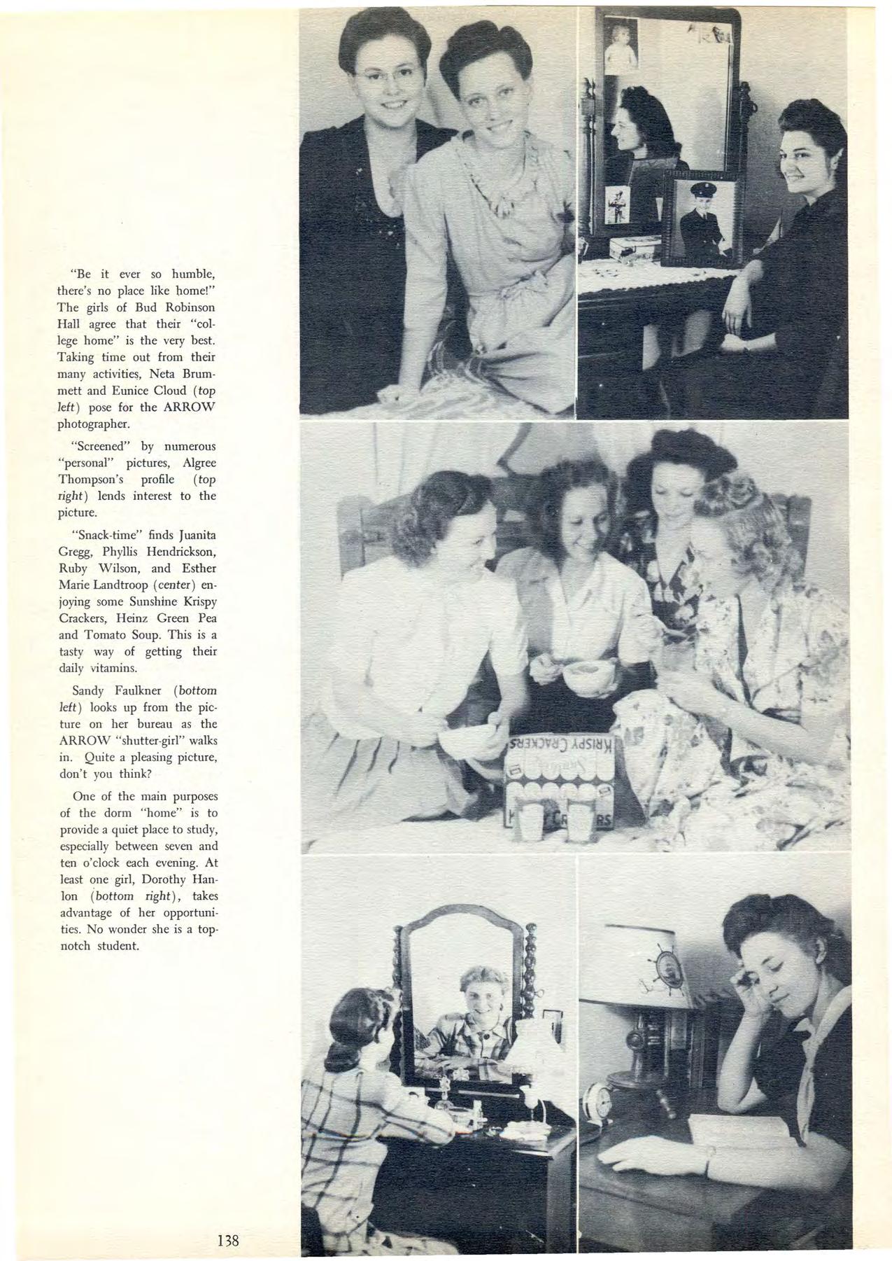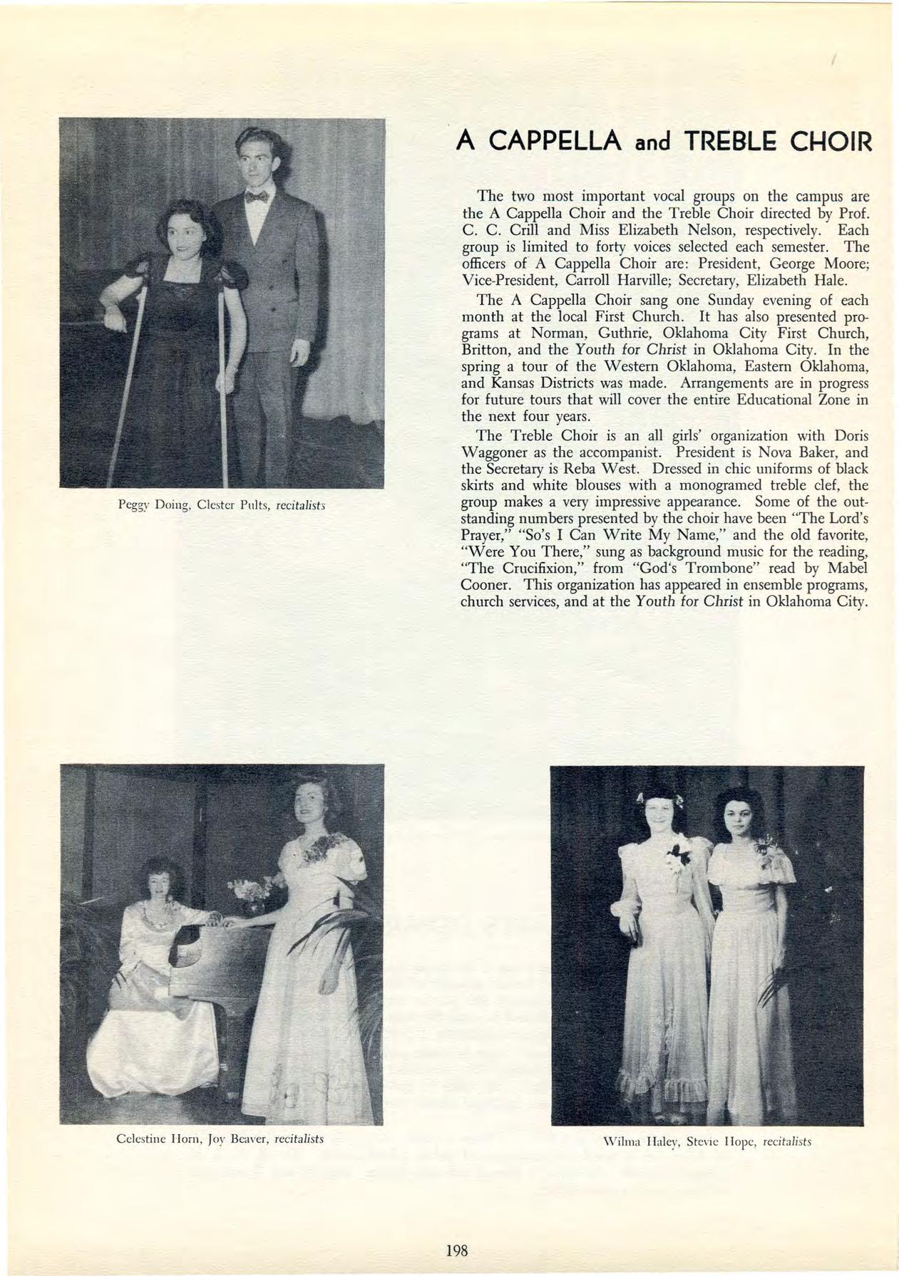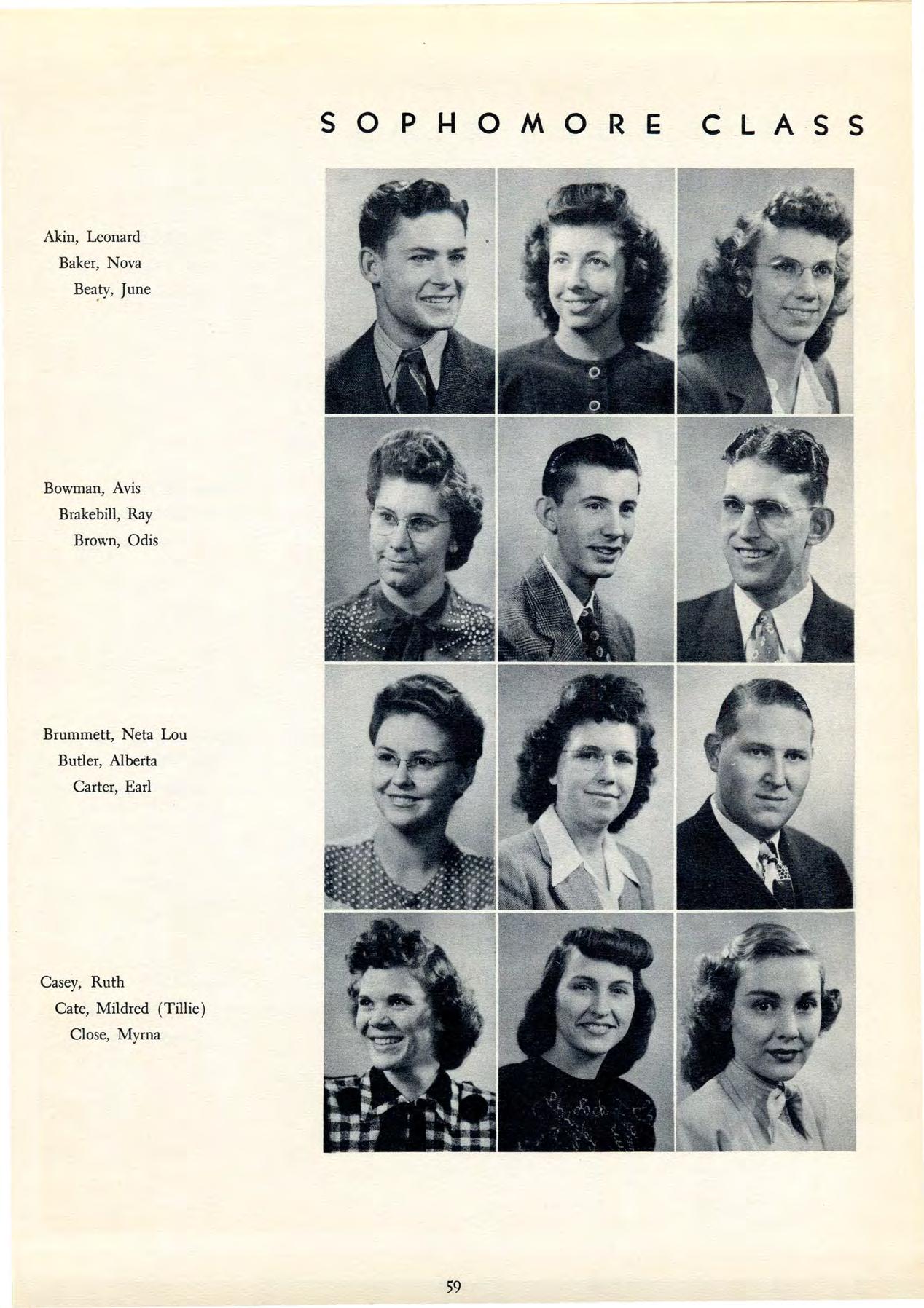 Beaver, Joy (Sr) ______ 36, 77, 160, 198, 199 Bebout! Meredith (J) ______ 9, 69, 176, 178, 206 Beckel, Vivian (Sr) ______ 78, 104, 105, 176, 177, 178, 180, 222 Belcher, Rachel (Sr) ____ 78, 156, 176, 207 Bilby, Mary Nell (F) _ 42 Black , Wayne (F) ______________ II8, 121 Blake, Juanita (F) ------------------42 Blake, Wilma (]) _______________ 69, 139 Blankenship, Harold (F) ______ 43, 184, 205, 267 Bockmann, Fern (F) _88, 201 Bohannan, Peggy (F) ______ 33, 43, 123, 127, 133, 176 Bohannan , Aldean (Sp) - --4 3, 176 Bohannan, Myrl (F) ------------43 Bolerjack, Naomi (J) __ 69, 176, 201 Bonnette, Robert (F) - ------9, 88 Bornamann, Charles (Sp) ____________ 69 Bornamann, Pauline (Un) - - 85 Boston, Leroy (F) -43 Bowman, Nadine (So) _ 59 Bowman, Ra y (F)----------------- 9, 88 Brakebill, Ray (So)-------------- 59, 293 Brasher, Clara Belle (F) _______ _43 Brasher, Mildred (F) _________________ 88 Brazelton , W. W. (Sp) --9, 88 Brewer, Berman (F)--------------- - 43 Brock, Hildreth (J) ___ 69, 176, 177, 178 Brogdon, Lola Anne (F) ______________ 43 Brown, Alta (]) ________________ 69, 272 Brown, Odis (So) ______ 59, 111, 112, 114, 116, 118, 120, 121, 134, 140, 176 Browning, Juanita (Sp) ______ 85 Browning, _ Lillian (Sp) ________________ 69 Browning, Phyllis (F) ________________ 43 Bruce, Robert (F)-------- 9, 88 Brummett, Neta (So) ______ 59, 13.8, 176, 178, 200, 201 Buffington, Ralph (J) ______ 69, 176, 177, 178, 216 Burdue, Ora (F) - - - - - - - - - - - 9 Burton, Leonard (F) ----9, 220 Butler, Veatrice (F) ______ 43, 96, 176, 177, 179, 186, 211 Butler, Mildred (F)----------------- 43 Butler, Alberta (So) ____ 59, 176 Bynum, C H. (Sp) ________________ 9, 85 Bynum, Howard (Sr) _____________ 78, 222 Cantrell, Bailey (J) -------------9, 88 Carden, Robert (F) ---9 , 88 Cargill, George "Bud" (F)---------- 9, 88 Cargill, Juanita (Un) _________________ 89 Carl, Maxine (So) _______________ 69, 293 Carleton, Sherrill (F) ----------------4 3 Carr, Venetia (F) -----44 Carter, Earl (So) _ 59, 135, i76, 177, 178, 200, 20 I Carter, Ruth (F)-------------- 44, 76, 188 Casey, Ruth (So) _ 59, 122, 126, 199, 219 Cason, Fred (F) _41, 44, 117, 133, 176, 177, 200 Cason, Jaqette (F)--- 44, 176, 220 Cason, Janice (F) ____________ 44, 176, 220 Cate, Mildred (So) ______________ 59, 184 Cherry, Margie (F)---------- 44, 176, 188 Cheveallier , Pauline (F) __ 56 , 177, 178 Classen , Betty (Sr) ___________ 78, 207 Clauson, Frances (F) ______ 44, 176, 177, 178, 189 Clay, Peggy (F) _________ 44, 133, 134, 199 Clemons, Barney (F)- 44, 201 Close, Myrna (So) _ 59, 132, 205, 207 PROPOSED SECOND BOYS' DORMifORY 323