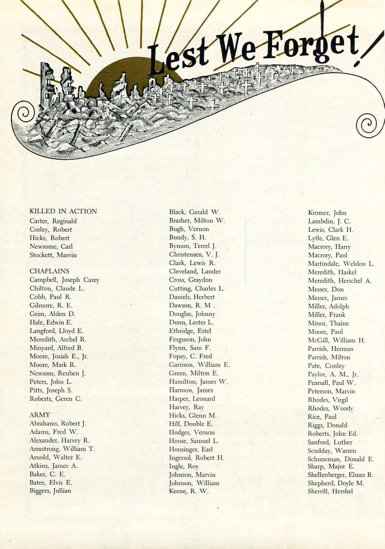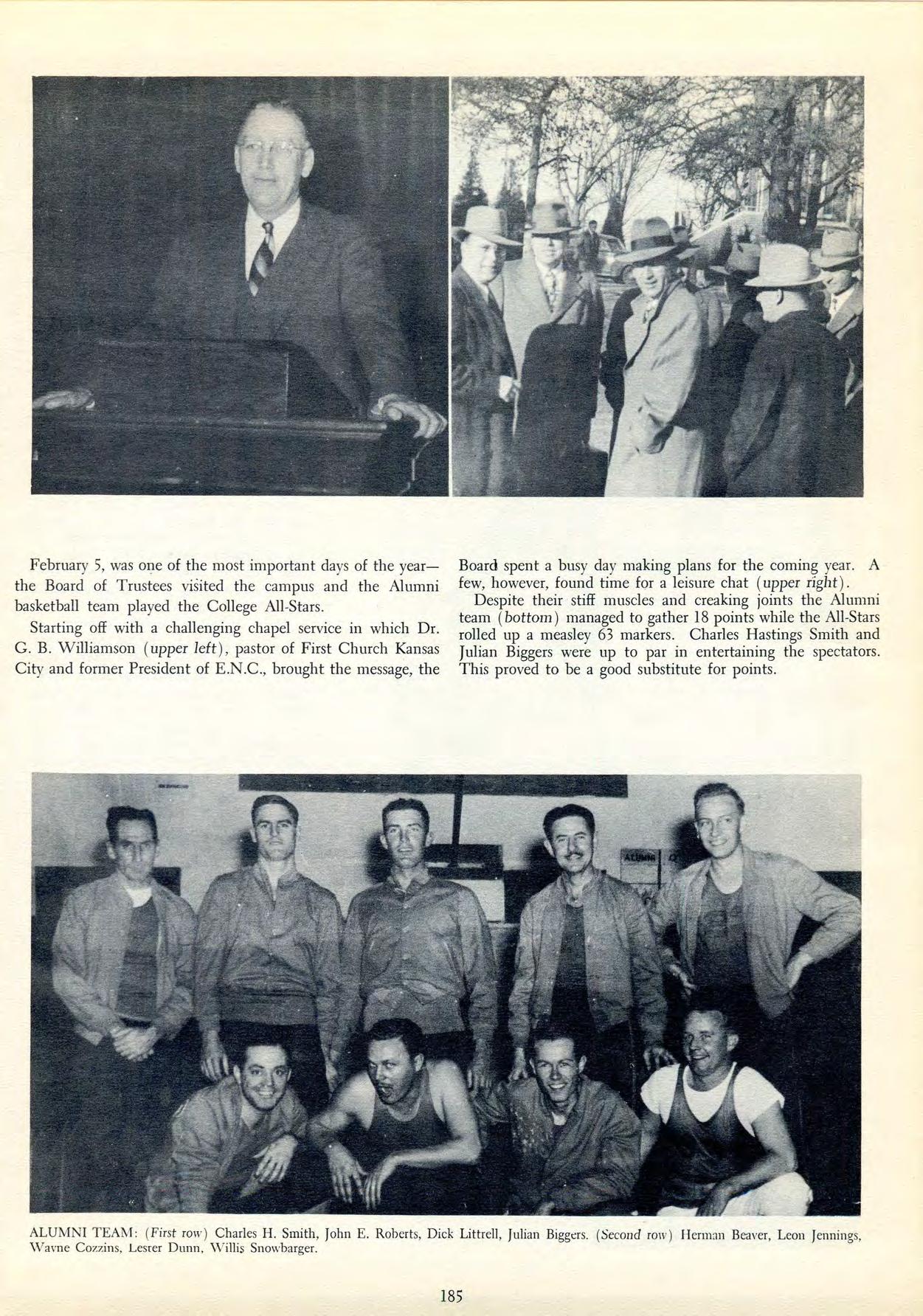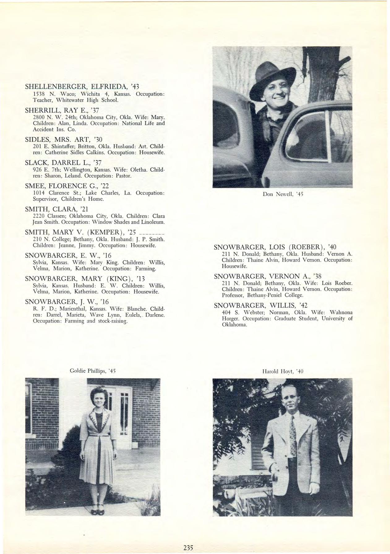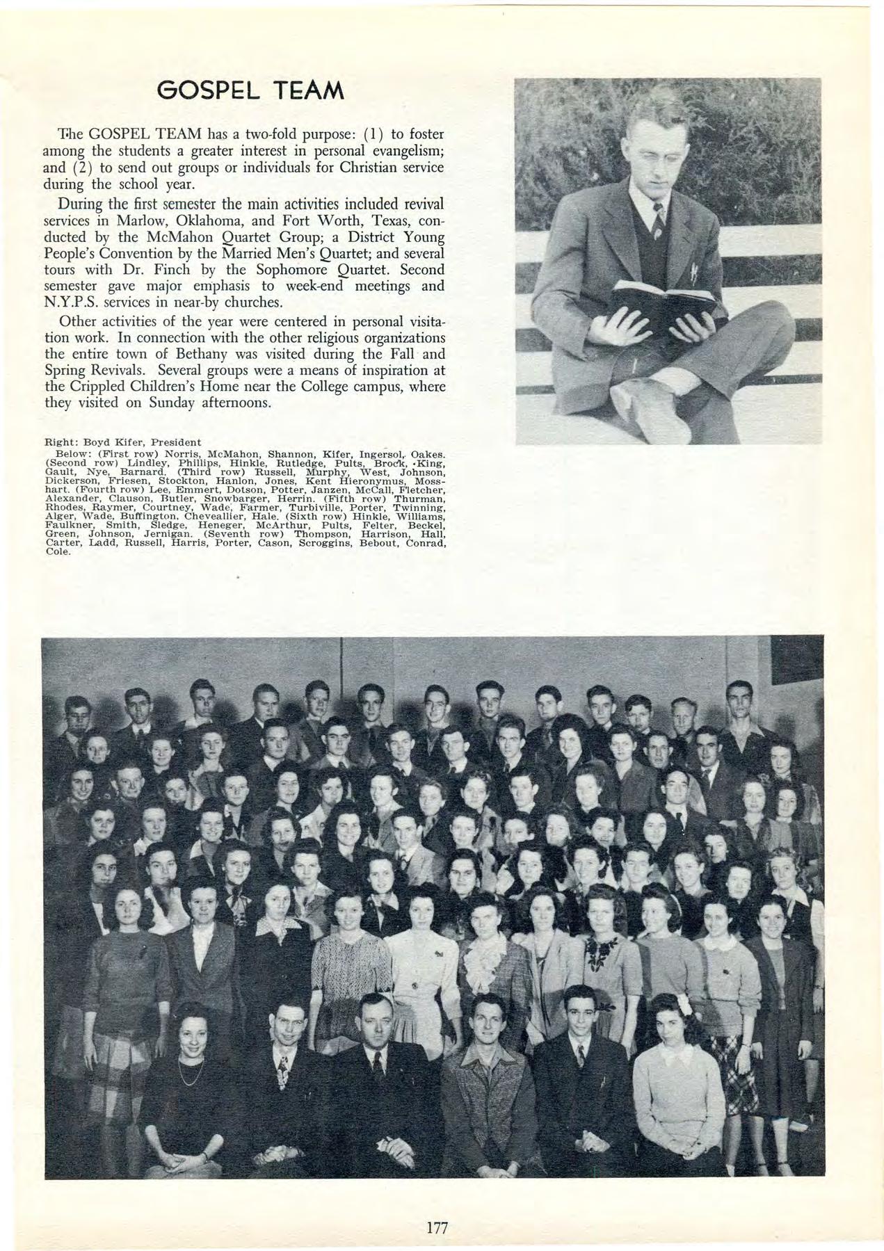 Beaver, Joy (Sr) ______ 36, 77, 160, 198, 199 Bebout! Meredith (J) ______ 9, 69, 176, 178, 206 Beckel, Vivian (Sr) ______ 78, 104, 105, 176, 177, 178, 180, 222 Belcher, Rachel (Sr) ____ 78, 156, 176, 207 Bilby, Mary Nell (F) _ 42 Black , Wayne (F) ______________ II8, 121 Blake, Juanita (F) ------------------42 Blake, Wilma (]) _______________ 69, 139 Blankenship, Harold (F) ______ 43, 184, 205, 267 Bockmann, Fern (F) _88, 201 Bohannan, Peggy (F) ______ 33, 43, 123, 127, 133, 176 Bohannan , Aldean (Sp) - --4 3, 176 Bohannan, Myrl (F) ------------43 Bolerjack, Naomi (J) __ 69, 176, 201 Bonnette, Robert (F) - ------9, 88 Bornamann, Charles (Sp) ____________ 69 Bornamann, Pauline (Un) - - 85 Boston, Leroy (F) -43 Bowman, Nadine (So) _ 59 Bowman, Ra y (F)----------------- 9, 88 Brakebill, Ray (So)-------------- 59, 293 Brasher, Clara Belle (F) _______ _43 Brasher, Mildred (F) _________________ 88 Brazelton , W. W. (Sp) --9, 88 Brewer, Berman (F)--------------- - 43 Brock, Hildreth (J) ___ 69, 176, 177, 178 Brogdon, Lola Anne (F) ______________ 43 Brown, Alta (]) ________________ 69, 272 Brown, Odis (So) ______ 59, 111, 112, 114, 116, 118, 120, 121, 134, 140, 176 Browning, Juanita (Sp) ______ 85 Browning, _ Lillian (Sp) ________________ 69 Browning, Phyllis (F) ________________ 43 Bruce, Robert (F)-------- 9, 88 Brummett, Neta (So) ______ 59, 13.8, 176, 178, 200, 201 Buffington, Ralph (J) ______ 69, 176, 177, 178, 216 Burdue, Ora (F) - - - - - - - - - - - 9 Burton, Leonard (F) ----9, 220 Butler, Veatrice (F) ______ 43, 96, 176, 177, 179, 186, 211 Butler, Mildred (F)----------------- 43 Butler, Alberta (So) ____ 59, 176 Bynum, C H. (Sp) ________________ 9, 85 Bynum, Howard (Sr) _____________ 78, 222 Cantrell, Bailey (J) -------------9, 88 Carden, Robert (F) ---9 , 88 Cargill, George "Bud" (F)---------- 9, 88 Cargill, Juanita (Un) _________________ 89 Carl, Maxine (So) _______________ 69, 293 Carleton, Sherrill (F) ----------------4 3 Carr, Venetia (F) -----44 Carter, Earl (So) _ 59, 135, i76, 177, 178, 200, 20 I Carter, Ruth (F)-------------- 44, 76, 188 Casey, Ruth (So) _ 59, 122, 126, 199, 219 Cason, Fred (F) _41, 44, 117, 133, 176, 177, 200 Cason, Jaqette (F)--- 44, 176, 220 Cason, Janice (F) ____________ 44, 176, 220 Cate, Mildred (So) ______________ 59, 184 Cherry, Margie (F)---------- 44, 176, 188 Cheveallier , Pauline (F) __ 56 , 177, 178 Classen , Betty (Sr) ___________ 78, 207 Clauson, Frances (F) ______ 44, 176, 177, 178, 189 Clay, Peggy (F) _________ 44, 133, 134, 199 Clemons, Barney (F)- 44, 201 Close, Myrna (So) _ 59, 132, 205, 207 PROPOSED SECOND BOYS' DORMifORY 323