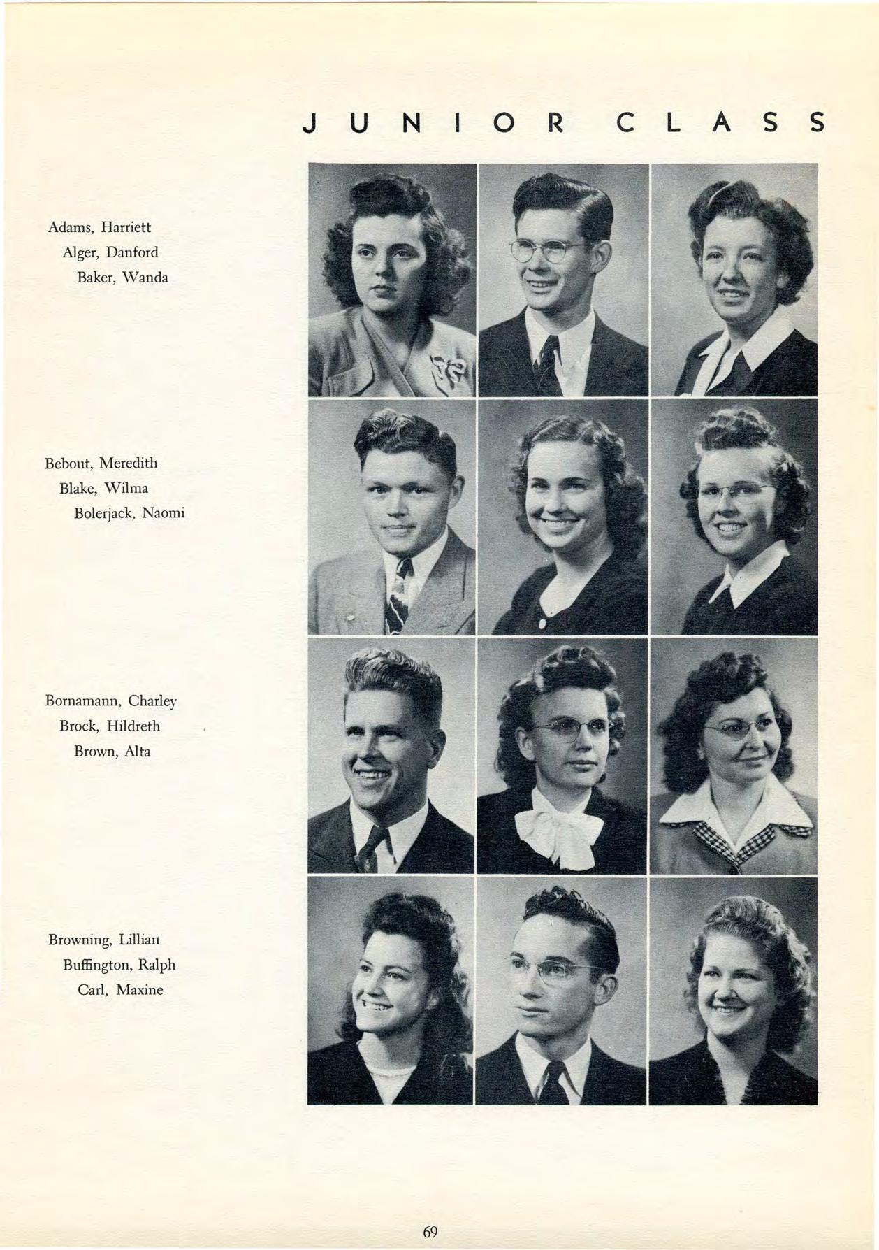 -AAdams, Harriette (]) ___ 69, 139, 197, 206 Adkins, Doris (F) ___________________ 88 Akin, Leonard (So) _59, 135, 219, 253 Alexander, Mayme (Sr) ______ 77, 176, 177, 178 Alger, Danford (]) ______ 69, 100, 110; 117, 176, 177, 178, 206 Andrew, Blanche (Sr) ______ 77, 179, 204, 205, 207 Andrew, J. C . (Sp) ______ 105, 313 Andrew, Lewis ( Sr ) _____ 77, 109, 110 , 112 , 118, 121 , 207, 208 Attaway, Charles (Sp) ________________ 57 -BBabcock, Dorothy (F) ________________ 42 Babcock, Lois (F) 42 Babcock , Marguerite (F) ______ 42, 123, 132 Baker , Juanita (Sr) ___________ 33, 77, 176 Baker, Nova ( So) ________ 33, 59, 176, 199 Baker, Wanda (]) ______ 69, 121, 123 , 125, 127, 128 Baker, Wilson (F) - 9, 88 Baldwin, Gary (F) ________ 9, 42, 119, 176 Baldwin , Irene (F) _______________ 33 , 42 Baldwin , Oliver (Un) __ 9, 192, 201 Ball, Mable (F) _____ 42 , 132, 173 , 199, 203 Ballard , Albert (F) --42, 220 Barnard, Elnora (Sp) ________ 85, 176, 177 Barnes, Opal (F) ---------------42, 176 Bates, Milton (F) 42, 261 Bawcum " Koleta (F) -----------------42 Bean, Joe (F) ________ 9, 88, 117, 118, 120, 121 Beaty, June (So) ___ 59 , 173, 178, 199 , 201 , 207 Beaver, Don (Sr) ______ 34, 37, 77, 110, 118, 132, 136, 146, 199, 207