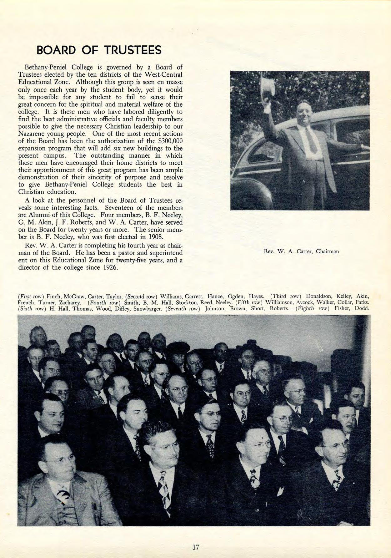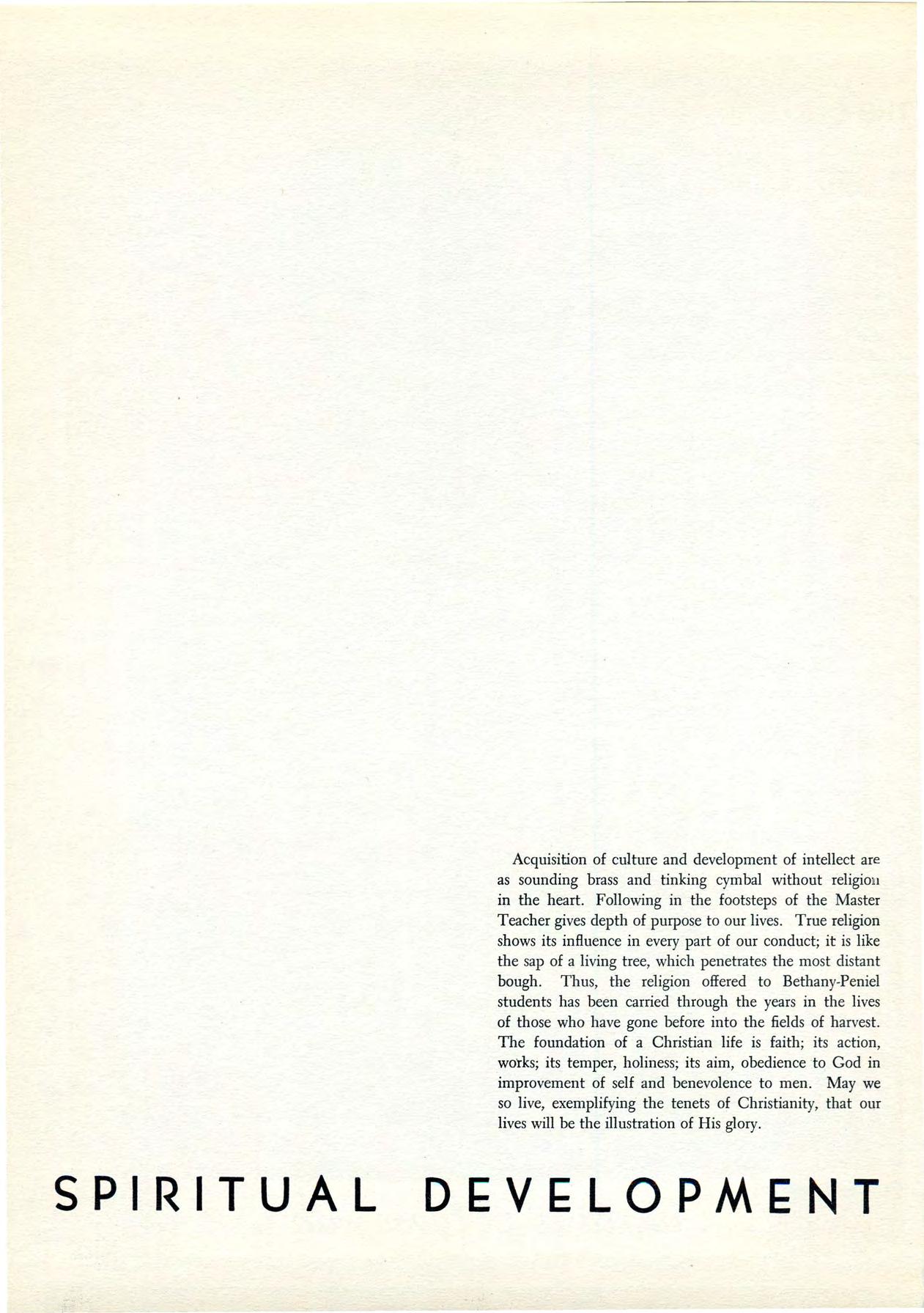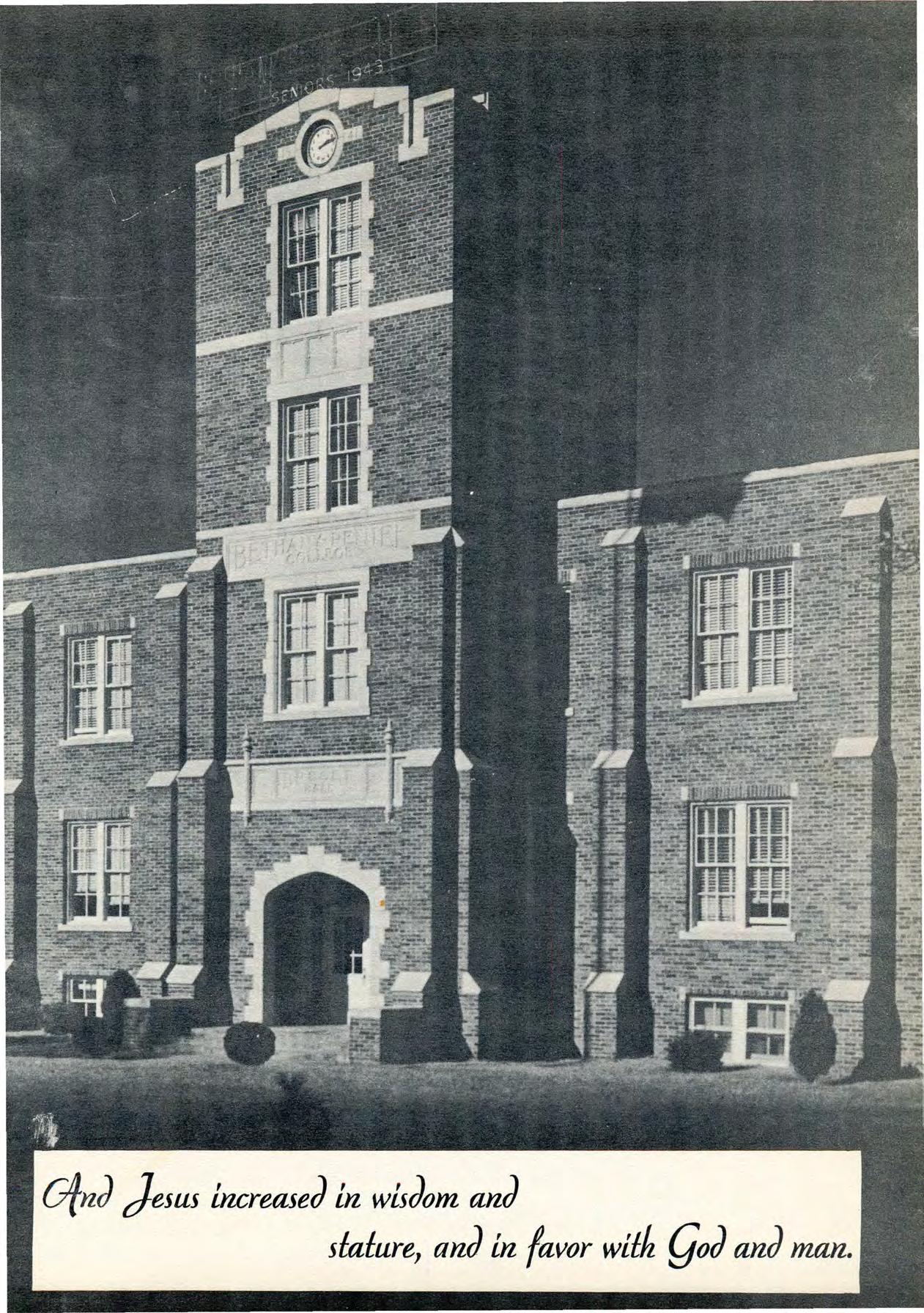 Following the pattern set by Christ as He "increased in wisdom and stature, and in favor with God and man," our Bethany Peniel College of today is striving to achieve in the lives of its students a fourfold purpose-mental, physical, spiritual, and cultural development. Thus, clues to the real riches of well-rounded living are in the possibilities of campus activities Guide-posts that point to successful futures are in the words that fall from the lips of professors and in the principles which were ingrained into this school with the first brick laid.