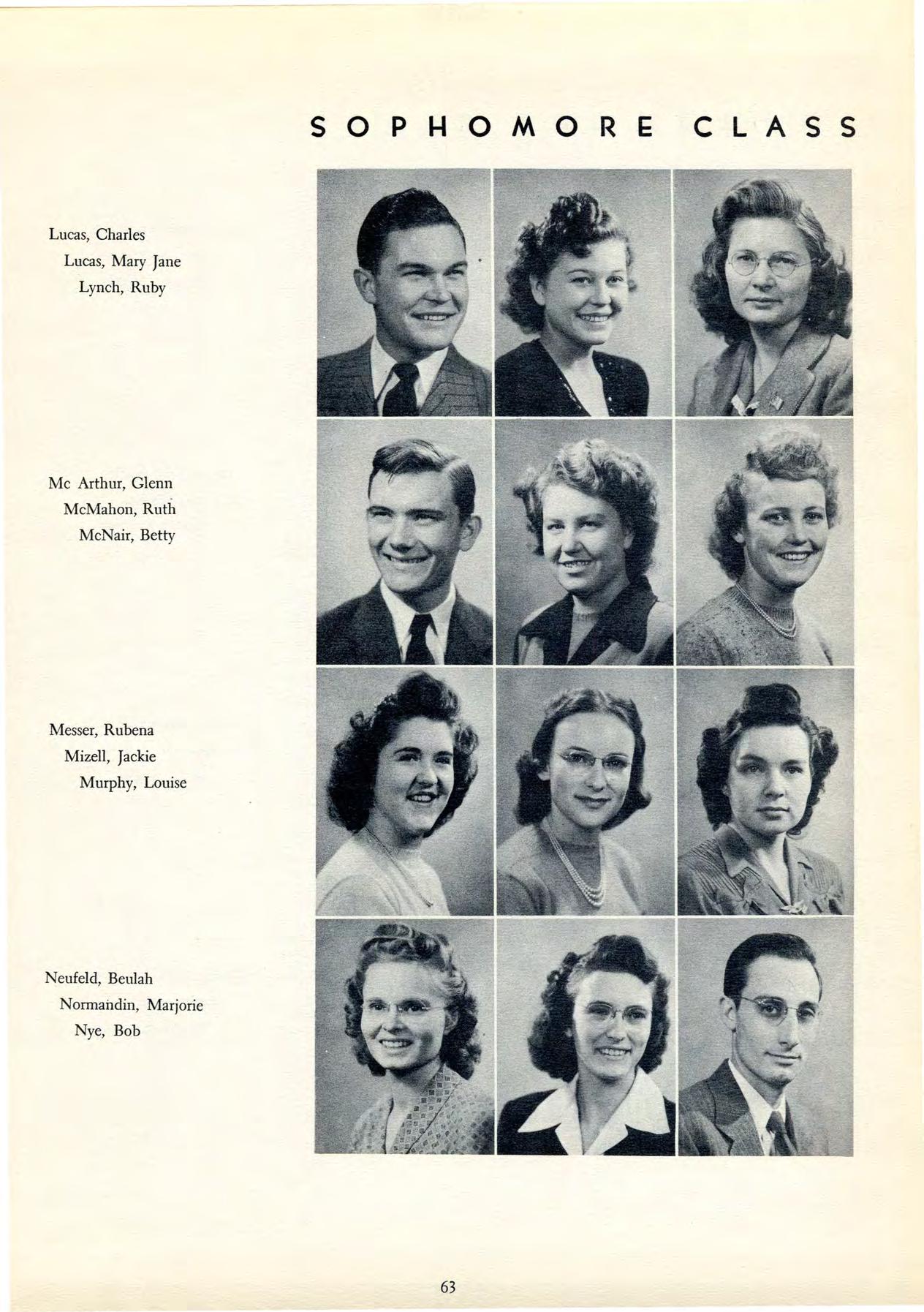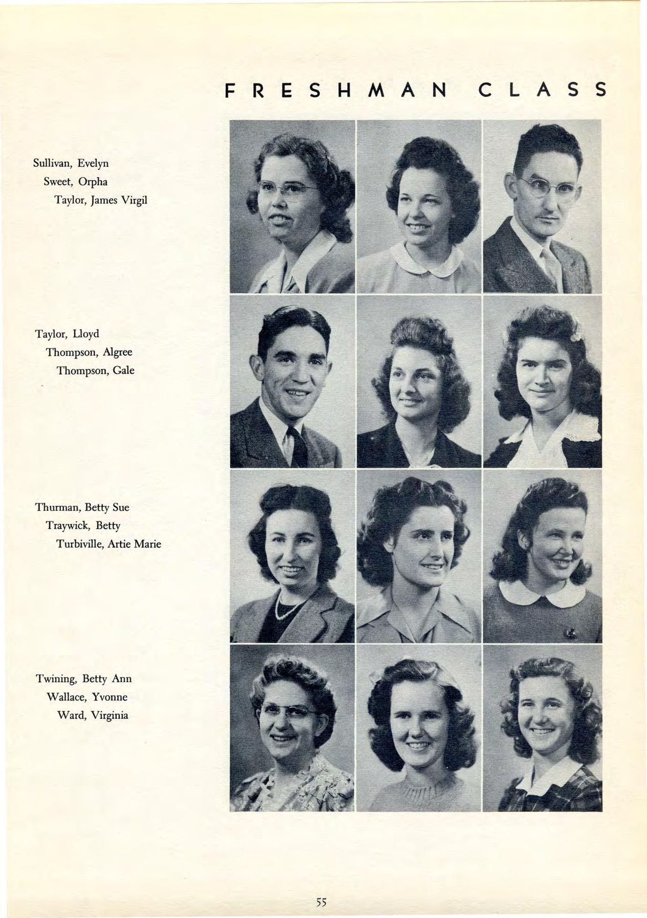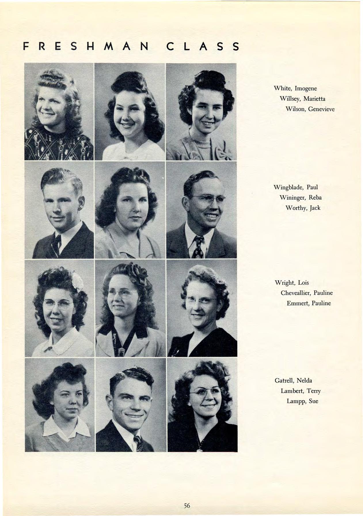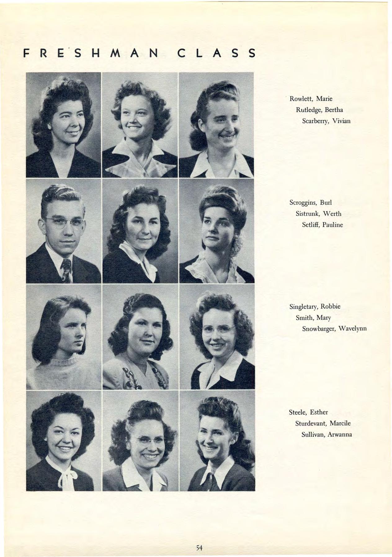 Robertson, Gladys (Sp) _______________ 87 Robertson , James (Jr) ____ 7 3, 269 Bobnett, Clifton (Jr) _________________ 73 Roeber, Mildred (So) ______ 64, 140, 184, 199, 201 Rogers , Ellen Marie (Jr) ______ 73, 139, 207 Rosburgh, Elvin (So) _______________ 64 Rose , Martha Lee (F) _ 53 , 57 Rowlett , Frances (So) __________ 65 Rowlett, Marie (F) ______________ 54, 188 Russell , Reyndal (Jr) __ 68, 73, 176, 177, 206 , 218 Russell , Mildred (S r) _81, 177, 178, 222 Rutledge , Bertha (F) ___ 54, 176,177,216 -SSanford , Elaine (So) _____ 65, 208 Scarberry, Vivian (F) _ 54 Scott, Herbert (F) _ 57, 96, 104, 133, 176, 200, 201 Scroggin , Eugene (S r) ______ 82, 54, 113, 179 , 216 Scroggins , Burl (F) ___ 9 , 176, 177, 178, 216 Setliff, Pauline (F) ___________ 54, 176, 199 Shaw, Luther ( So ) __ 65 Shellenberger, Elmer (J) ______ 9, 93, 11 7, 121, 214, 215 Shreffler, Charles (F)--------------- 9, 93 Simmons, Earl (F)----------------- 57 Simpson , Alta (Sp) _87, 268 Simpson , Paul (J) ______ 100, 110, 206, 207 Singletary, Robbie (F)- - - - 54 Sistrunk, Werth (F}------54, 13 7, 180 , 199 Sledge, Wayne (J} _ 7 3, 110 , 139, 176, 177, 202 Smith, Byron (Sp) ______ 87 Smith , Clara Jean ( F) ________ 65, 67, 208 Smith , Duane ( Sp ) __________________ 184 Smith, Floyd (S p ) - 291 Smith , J Russell (J) _____ 73, 100 , 110, 176 177, 206, 262 Smith, Mary (F)---------------- - 54 Smith, Violet (Sp) -------------------9 3 Smith, Wallace 9, 93 Smith, Bill (So) _____________________ 65 Smock, Hazel (F)------ - 93 Snow, Richard (So) _65, 199, 202 Snowbarger, Marieta (So) ____ 65, 126, 176. 207 Snowbarger, Wave Lynn (F) __ 54, 176, 177, 178 Stands, Jacob ( Sr) __ 82, 110, 118, 179 Stands, Talmadge (J) ______ 82, 179, 208 Steele, Esther (F) -·- --33, 54 Steele, Leona (So) ___________ 65, 134, 178 Stevens, Wayman (So)---------- - q5, 100 Stewart , Retis (J) _ 73 Stinson, Verhie (Sp) _ 87 Stockton, Kittie Jayne (So) __ 65, 137, 199 Stockton, Delene (J ) ______ 36 , 68, 73, 152 , 176, 177, 178 , 206, 207 Stone, Elaine ( Sp) __ 87; 201 Sturdevant, Marcile (F) _______________ 54 Sullivan , Arwanna ( F ) _ 54 , 127, 128 , 176 Sullivan , Evelyn (F) __________ 55, 248 Sullivan, Ruth Anne (F) ______ 65, 126, 176, 193 Sutton, Geraldine (F) ___ 33, 66, 176, 199 Sweet, Orpha ( F) ____ 55 -TTalbert, Beatrice (F )-------- ---------93 Taylor, Ed (Sr) _75, 82, 110, 15 8, 193, 308 Taylor, Lloyd ( F) 55, 202, 219 Taylor, Minnie Lea ( Sr) ______ 82, 176, 193 , 222 Rubye (So ) __ 66 Taylor , Tressie (Sp) ______ 66 Taylor, Virgil ( F) 133, 202 Thompson , Algree (F) _________ 55, 138 Thompson , Dorothy (J) ___ 73 Thompson , Gafe (F) _________________ 55 Thompson , Lerline (J) _73, 269 Thompson , Lewis (So) ____ 58, 66, 100, 111, 177; 199, 202, 205, 211, 217 Thompson, Luna Ruth (So) ______ 66, 141, 199 Thompson, Mary Louise (So) ___ 66, 199 Thompson , R. L. (J) _________ 74, 110 Thompson, Richard (So) ________ 66, 111, 135, 176, 199, 217 Thompson , Marceline (Sp ) ___________ 132 Thurman, Betty Sue (F) ______ 55 , 177, 178, 180 Timm, Pearl (So) ___________________ 66 Tinsley, Doris ( Sp ) - - ---93 Tragey, Mary Louise (So) ____ 184, 211, 293 Tra ywick , Betty (F) ___ 55, 296 Troutman , Robert (J) ____________ 74, 141 Tudor, Perr y (Sr) ___ 82, 112, 166, 186 Turbiville, Artie (F) _________ 55, 177, 314 Turner, Edwina ( F) ______ 93 , 12 7 Twining, Betty Ann (F) ___ 55, 176, 177, 178, 201 327 - UUlmet, Ruth ( F)- - 57, 211 -VVerbeck, Eugene (J) _____ 74, 99, 110, 117, 119, 173 , 206, 20 7, 217, 243 Verbeck , Neva (Sp) ___ _, ____ 87, 248 , 252 Wade, Beulah (Sp) __________ 87 , 176, 177 Wade , Bruce (Sp) __ T 84 , 87 , 176, 210, 252, 253 Wade, Lettie (So) ______ 66, 176, 177, 178, 179, 180 Waggoner, Doris (So) ___ 66, 199, 201, 273 Walker, Tella (Sp) - -----9 Walker, Wana (Sr) __________ 83, 141 , 204 Wallace, Yvonne (F) _____________ 33, 55 Ward , Virginia (F)----- -----------55 Ware, Tillie (J) ______________ 74, 129 , 139 Warren, Winnie (So) _ 66 Watson, James (So) 121 Watson, Loy (So) _______________ 67, 179 Wessels, Dean (Sr) _____ 9, 75, 83, 110, 162, 179, 207, 209 West, Reba Ol ----33, 74, 176, 177, 178, 180, 199, 208 White, Imogene (F) ___ 56 , 176, 314 White, Patricia (F)-------------- 93, 199 Wickham, Alma Jo (Sp) __________ 87 Wiggs, Emma Frances ( So) ______ 67, 176, 199, 203 Williams, Rosey ( So ) ______ 67, 12.2 , 126, 128, 13 7, 176, 177, 178 , 187 , 188, 199 Williamso?, Marjorie (J) 93 Williamson, Lois ( So ) ___ 67, 122 , 124, 125 , 126, 128, 129 Willsey, Marietta (F) ___ 56, 187 Wilson, Betty (So) _________________ 67 Wilson, Garrett ( Sp) ____ 87, 132, 179 Wilson, Genevieve (F) ________ 33, 56, 219 Wilson, Ruby (J) ______ 121 , 123, 124, 127, 128, 138, 141, 201 Wingblade, Paul (F) _________________ 56 Wininger, Reba (F) _____________ 56, 176 Winter, Selma (So) ___ 200, 248 Wood, Elton (So) _____ 67, 120, 135, 176, 177, 190, 269, 273 Worthy, Jack (Sp) __________________ 56 Wright, Lois (F) ____ 56