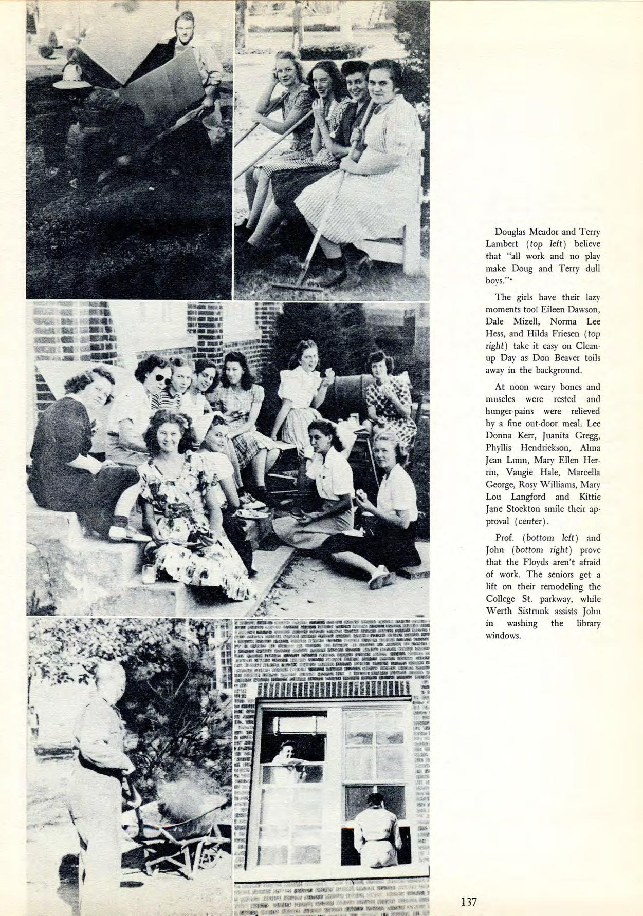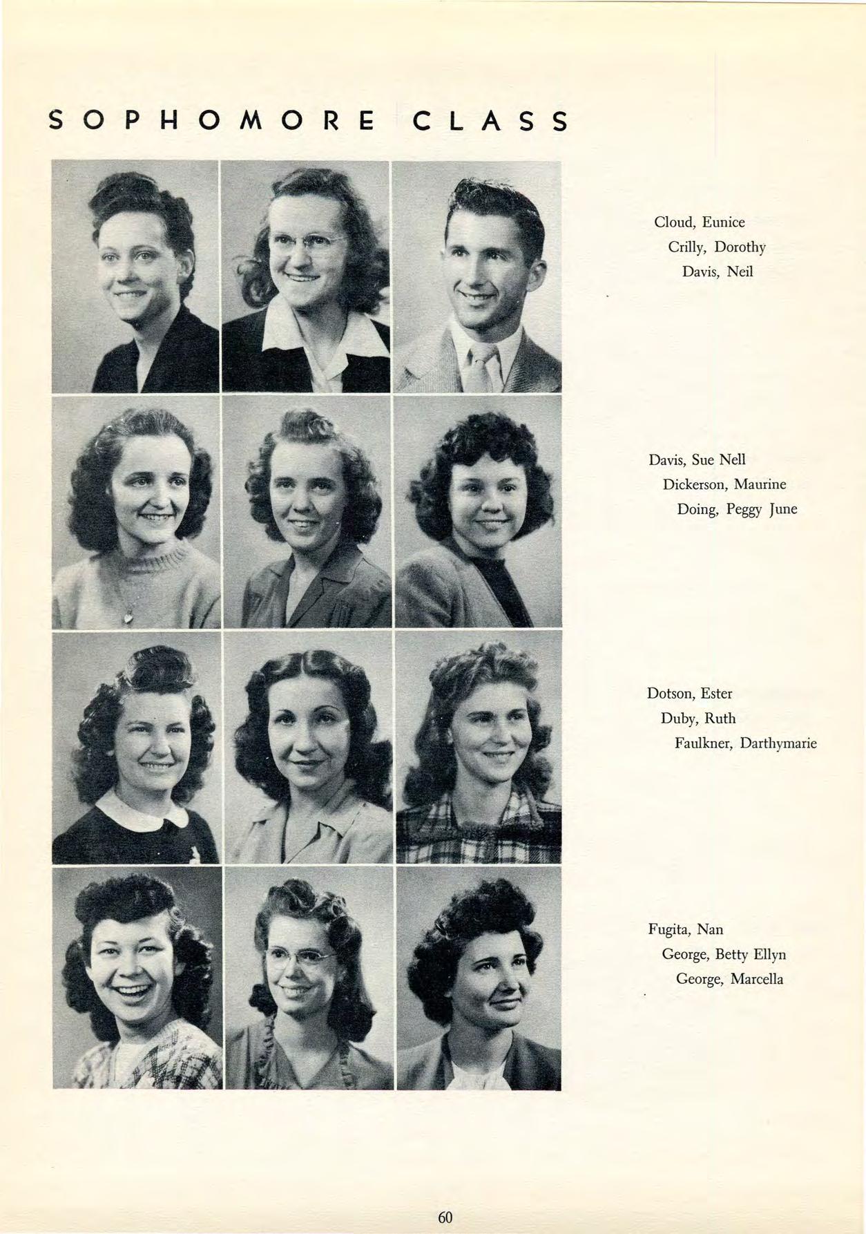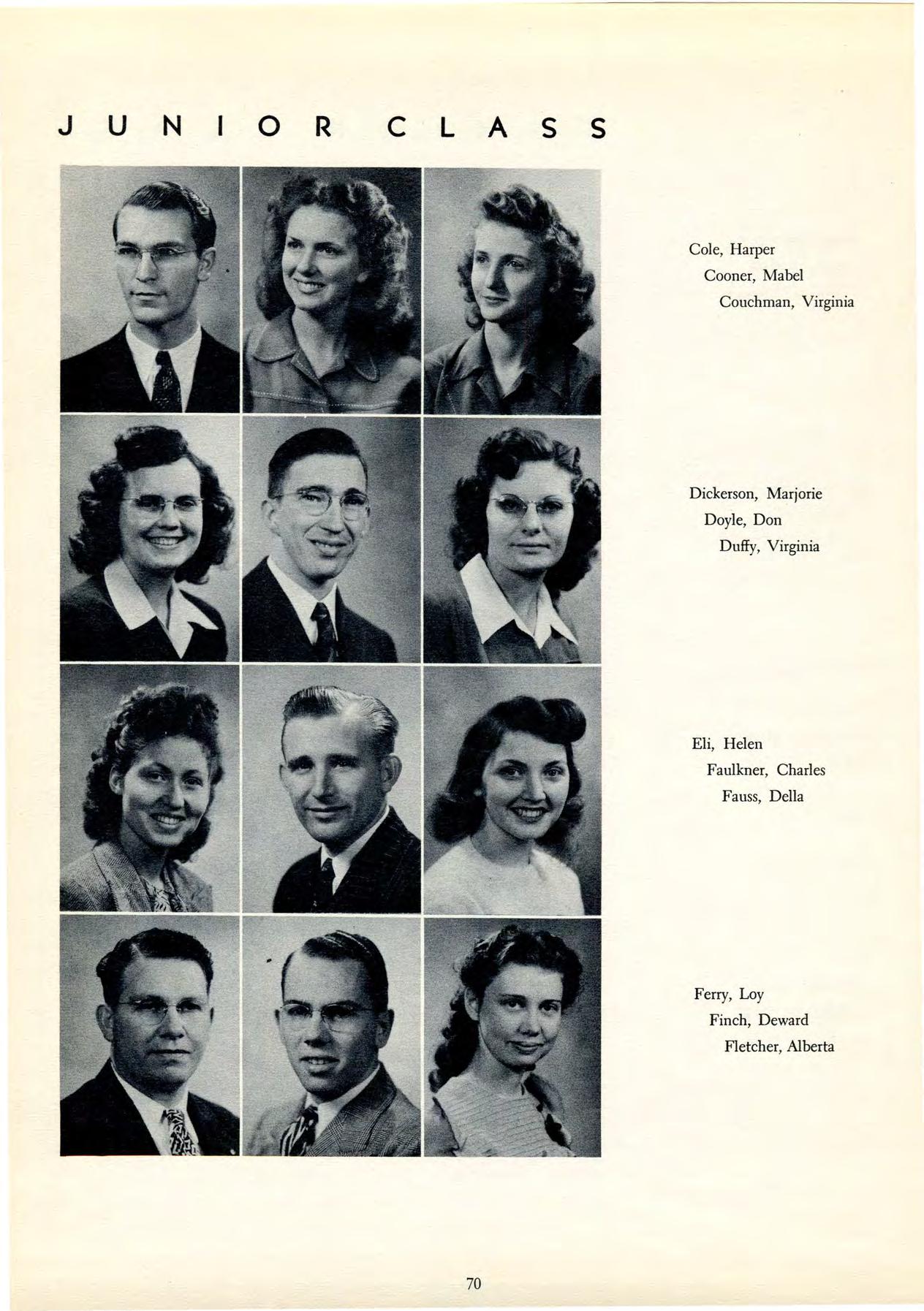 Cloud, Eunice (So) ______ 60, 122, 138, 176, 178 Clouse, Lenora (So) _ 89 Coale, John (F)---------- - 9, 45, 96 Cole, Harper (J)_-_____ 70, 173, 177, 207, 208, 298 Collett, Alta (F) - 44 , 176 Collins, Carl (F) ______________ 89 Colson, Edwanda (F) ______ 176 Conrad, Ernest (F)------9, 44, ll1, 113 , 121, 176, 177, 178 Cooner, Mabel (J) _70, 176, 199, 205 Coppock, Bonnie (F) ______45, 123, 124, 127, 129, 2ll Cornelius, Ruben (F) _ 89 Cornelson , Anna (Sp) ______________ 85 Cottam, Theodore (Un) _9, 220 Couch, Helen (F) ____ _45 Couchman, Virginia (J) ______ 68, 70, 139, 176, 179, 190 Courtney, Geraldine (F) ______ 45, 96, 104, 176, 177, 178, 190 Covey, Ruth (F) ------------------45 Craig, Peggy (So) ________ 89 Crawford, Lively (F) ______ 9, ll1, 141, 176, 179 Crilly, Dorothy (F) _____________ 60, 176 Culbertson, Nolan (Sp) _______ 85 Cypert, Tommie (F) -----------------45 -DDalaba, Gene (F) ---------------45, 205 Darden, Fannie Beth (F) ________ 45 , 189 Davenport, Lee (Un) ----------------9 Davenport, Lillie Mae 0)----- - 74, 189, 206 Davis, M. L. (F) _89, ll7, 219 Davis, Neil (So) __ 60, 120, 176 Davis, Sue Nell (So) __ 60 Dawson, Eileen (F) ______ 45, 137, 192, 199, 203 DeFoyd, Betty (So) _______ 89 Derby, Lavera (F) - - 45 Dickerson, Marjorie (J) _70, 176, 193, 214, 215 Dicker$On , Maurine (So) __ 60, 177, 190, 209 Dixon, Ruth (F) --------------------45 Dockery, Pauline (F) ________ 46, 132, 199 Doing, Peggy June (So) ______ 60, 132, 198 Dole, Bernice (F) --------46 Dotson, Esther (So) ______ 60, 176, 177, 199, 203 Doyle, Donald (J) ___________________ 70 Duffey, Avis (F) ________________ ...:46, 188 Duffy, Virginia (J) ______________ 70, 201 Duby, Ruth (So) ________________ 60, 13 5 Dunn, Verna (F) ____ 46, 184, 199, 218 -EEdwards, Marion (F) _46, 132, 134, 176 Eli, Helen (J) _______________________ 70 Emmert , H. C (So) _ 179 Emmert, Pauline (Sp) ______ 56, 176 , 177 Emmert, Ruth (So) ______ 74, 121, 127 Emmert, Velma (Sp) __ 85 Engleman, Maxine (Sp) __________ 85, 133 Eppler, Thomas (Sp) _________ 277 Ester, Donna (F) __________________ 46 -FFarmer, Constance (F) _____ _46, 176, 177, 199, 200 Faulkner, Charles (J) _____________ 70, 26'1 Faulkner, Darth yma rie (So) ______ 60, 138, 176, 177, 178, 180, 199 Fauss, Della (J) __________________ 70, 199 Felter, Wanda (F) _____ _46, 176, 177, 178 Ferry, Loy (J) _70, 96 Finch , Deward {J} - 70, 100, 113, 114, ll7, ll8, 121, 140, 141, 199, 202, 205, 219 324 Fletcher, Alberta (J) ______ 70, 176 , 177, 178 Flick, Willis ( F ) _____________ 46, 200, 201 Floyd, John (F) _46, ll1, 137 France, Ann (J) _ 7 1, 176, 199 , 206, 208, 2ll Frank, Joan (Sp) ___________________ 201 Francis, Ethel (F)--------------- 46, 209 Friesen , Hilda (F) ______ 46 , 137, 176, 177, 178 Fry, Georgiamae (J) ___ 71, 2ll Fugita, Nan ( So) __ 60, 140, 199, 203 Fulton, Cecil (F) ____________ 9, 89, 271 Fulton, Frances (Sp) __ 89 -GGamble, Albert (Sr) ______ 78, llO, ll8, 136, 173, 176, 179, 181, 218 Garrett, Earnest (J) __________________ 71 Gatlin, Verda ' (Sp) __________________ 85 Gatrell, Nelda (F) -------56 Gault, Joanna (F) ___ 47 , 176, 177, 178, 192 George , Betty Ellyn (So) ______ 60, 176, 200, 201 George, Marcella (So) ______ 60, 122, 13 7, 192 Gill, Mary Frances (F) ______________ 47 Gillespie, Inez (F) ______________ 47, 199 Girard, Margaret (F) ________ 47, 188, 189 Grant, Chad (F) _ 271 Gray, Robert (F) - ---------47 Green , Henry (Un) ----------------9, 89 Green, Milton (F) ______________ 89 Greene, Albert (Sp) ____ 85, 132, 133, 176, 177 Gregg, Juanita (J) _____ 61, 121, 122, 124, 125, 127, 128, 137, 138 Grisham, Elizabeth (F) ___ 47 Grissom , Robert (F ) _ 47 Grissom, Violet (Sp) _ 61 Groff, Anna Ruth (F) - -----------47