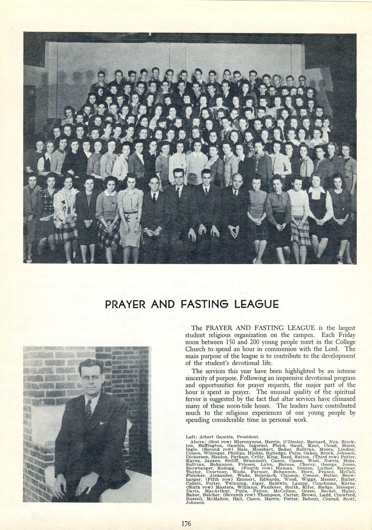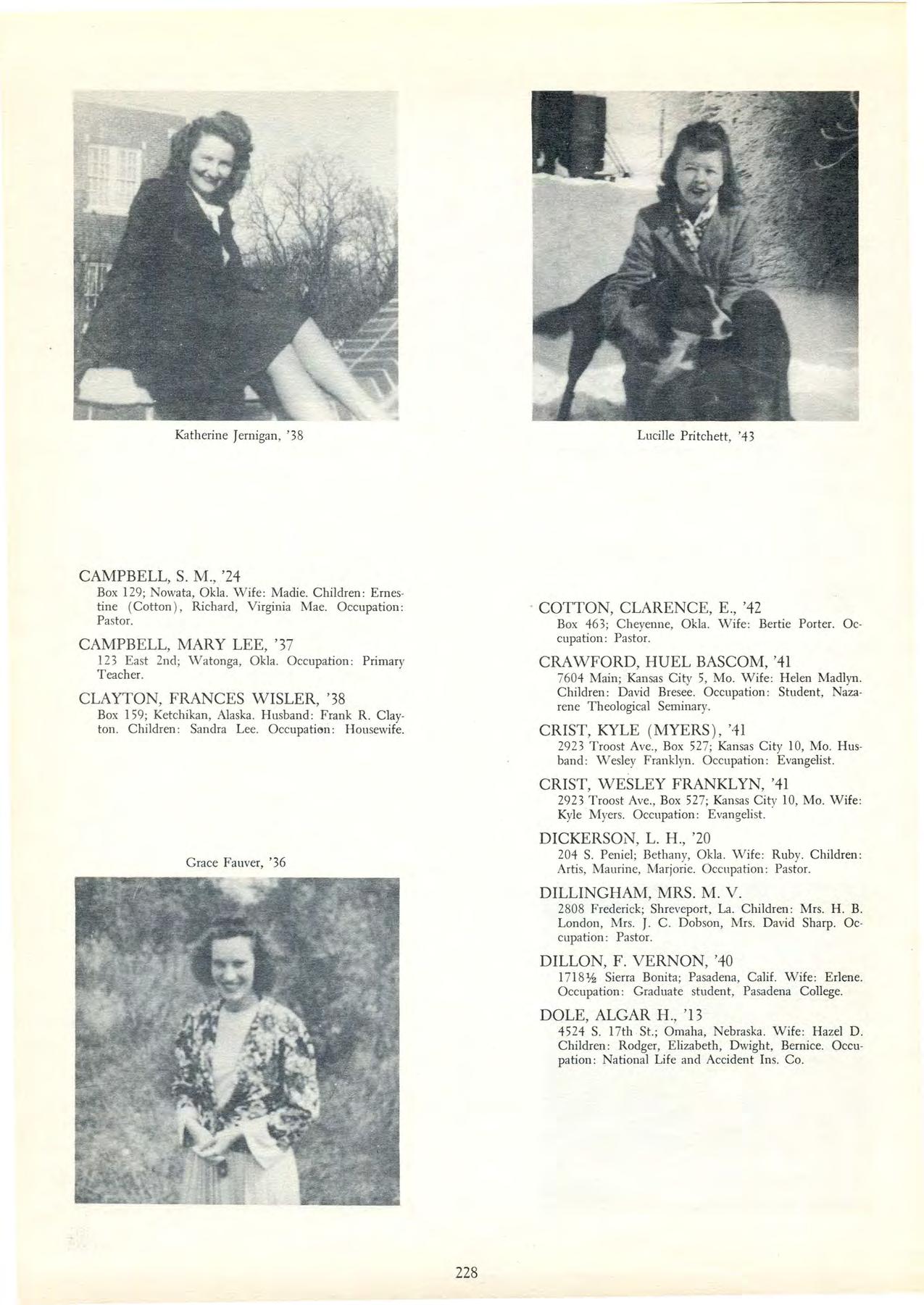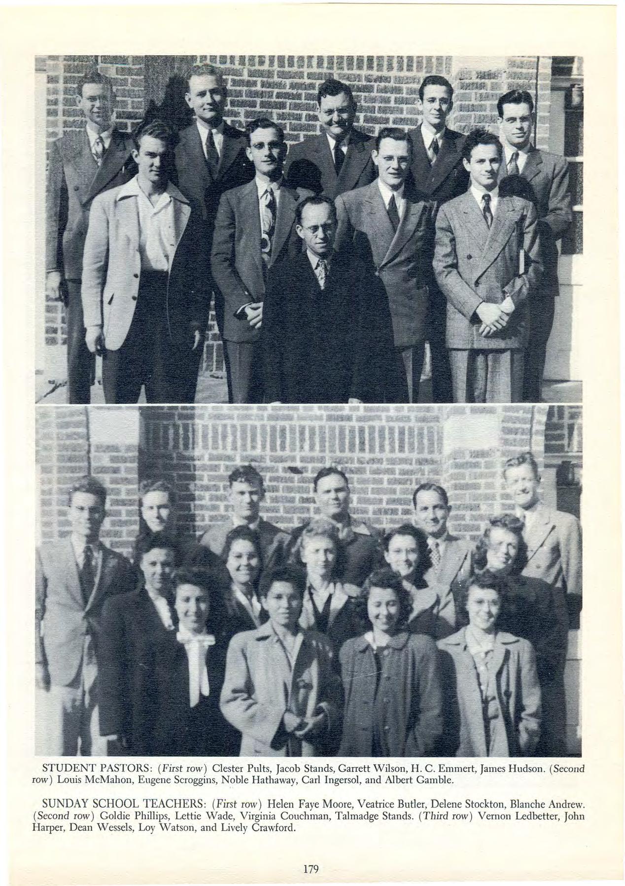 Cloud, Eunice (So) ______ 60, 122, 138, 176, 178 Clouse, Lenora (So) _ 89 Coale, John (F)---------- - 9, 45, 96 Cole, Harper (J)_-_____ 70, 173, 177, 207, 208, 298 Collett, Alta (F) - 44 , 176 Collins, Carl (F) ______________ 89 Colson, Edwanda (F) ______ 176 Conrad, Ernest (F)------9, 44, ll1, 113 , 121, 176, 177, 178 Cooner, Mabel (J) _70, 176, 199, 205 Coppock, Bonnie (F) ______45, 123, 124, 127, 129, 2ll Cornelius, Ruben (F) _ 89 Cornelson , Anna (Sp) ______________ 85 Cottam, Theodore (Un) _9, 220 Couch, Helen (F) ____ _45 Couchman, Virginia (J) ______ 68, 70, 139, 176, 179, 190 Courtney, Geraldine (F) ______ 45, 96, 104, 176, 177, 178, 190 Covey, Ruth (F) ------------------45 Craig, Peggy (So) ________ 89 Crawford, Lively (F) ______ 9, ll1, 141, 176, 179 Crilly, Dorothy (F) _____________ 60, 176 Culbertson, Nolan (Sp) _______ 85 Cypert, Tommie (F) -----------------45 -DDalaba, Gene (F) ---------------45, 205 Darden, Fannie Beth (F) ________ 45 , 189 Davenport, Lee (Un) ----------------9 Davenport, Lillie Mae 0)----- - 74, 189, 206 Davis, M. L. (F) _89, ll7, 219 Davis, Neil (So) __ 60, 120, 176 Davis, Sue Nell (So) __ 60 Dawson, Eileen (F) ______ 45, 137, 192, 199, 203 DeFoyd, Betty (So) _______ 89 Derby, Lavera (F) - - 45 Dickerson, Marjorie (J) _70, 176, 193, 214, 215 Dicker$On , Maurine (So) __ 60, 177, 190, 209 Dixon, Ruth (F) --------------------45 Dockery, Pauline (F) ________ 46, 132, 199 Doing, Peggy June (So) ______ 60, 132, 198 Dole, Bernice (F) --------46 Dotson, Esther (So) ______ 60, 176, 177, 199, 203 Doyle, Donald (J) ___________________ 70 Duffey, Avis (F) ________________ ...:46, 188 Duffy, Virginia (J) ______________ 70, 201 Duby, Ruth (So) ________________ 60, 13 5 Dunn, Verna (F) ____ 46, 184, 199, 218 -EEdwards, Marion (F) _46, 132, 134, 176 Eli, Helen (J) _______________________ 70 Emmert , H. C (So) _ 179 Emmert, Pauline (Sp) ______ 56, 176 , 177 Emmert, Ruth (So) ______ 74, 121, 127 Emmert, Velma (Sp) __ 85 Engleman, Maxine (Sp) __________ 85, 133 Eppler, Thomas (Sp) _________ 277 Ester, Donna (F) __________________ 46 -FFarmer, Constance (F) _____ _46, 176, 177, 199, 200 Faulkner, Charles (J) _____________ 70, 26'1 Faulkner, Darth yma rie (So) ______ 60, 138, 176, 177, 178, 180, 199 Fauss, Della (J) __________________ 70, 199 Felter, Wanda (F) _____ _46, 176, 177, 178 Ferry, Loy (J) _70, 96 Finch , Deward {J} - 70, 100, 113, 114, ll7, ll8, 121, 140, 141, 199, 202, 205, 219 324 Fletcher, Alberta (J) ______ 70, 176 , 177, 178 Flick, Willis ( F ) _____________ 46, 200, 201 Floyd, John (F) _46, ll1, 137 France, Ann (J) _ 7 1, 176, 199 , 206, 208, 2ll Frank, Joan (Sp) ___________________ 201 Francis, Ethel (F)--------------- 46, 209 Friesen , Hilda (F) ______ 46 , 137, 176, 177, 178 Fry, Georgiamae (J) ___ 71, 2ll Fugita, Nan ( So) __ 60, 140, 199, 203 Fulton, Cecil (F) ____________ 9, 89, 271 Fulton, Frances (Sp) __ 89 -GGamble, Albert (Sr) ______ 78, llO, ll8, 136, 173, 176, 179, 181, 218 Garrett, Earnest (J) __________________ 71 Gatlin, Verda ' (Sp) __________________ 85 Gatrell, Nelda (F) -------56 Gault, Joanna (F) ___ 47 , 176, 177, 178, 192 George , Betty Ellyn (So) ______ 60, 176, 200, 201 George, Marcella (So) ______ 60, 122, 13 7, 192 Gill, Mary Frances (F) ______________ 47 Gillespie, Inez (F) ______________ 47, 199 Girard, Margaret (F) ________ 47, 188, 189 Grant, Chad (F) _ 271 Gray, Robert (F) - ---------47 Green , Henry (Un) ----------------9, 89 Green, Milton (F) ______________ 89 Greene, Albert (Sp) ____ 85, 132, 133, 176, 177 Gregg, Juanita (J) _____ 61, 121, 122, 124, 125, 127, 128, 137, 138 Grisham, Elizabeth (F) ___ 47 Grissom , Robert (F ) _ 47 Grissom, Violet (Sp) _ 61 Groff, Anna Ruth (F) - -----------47