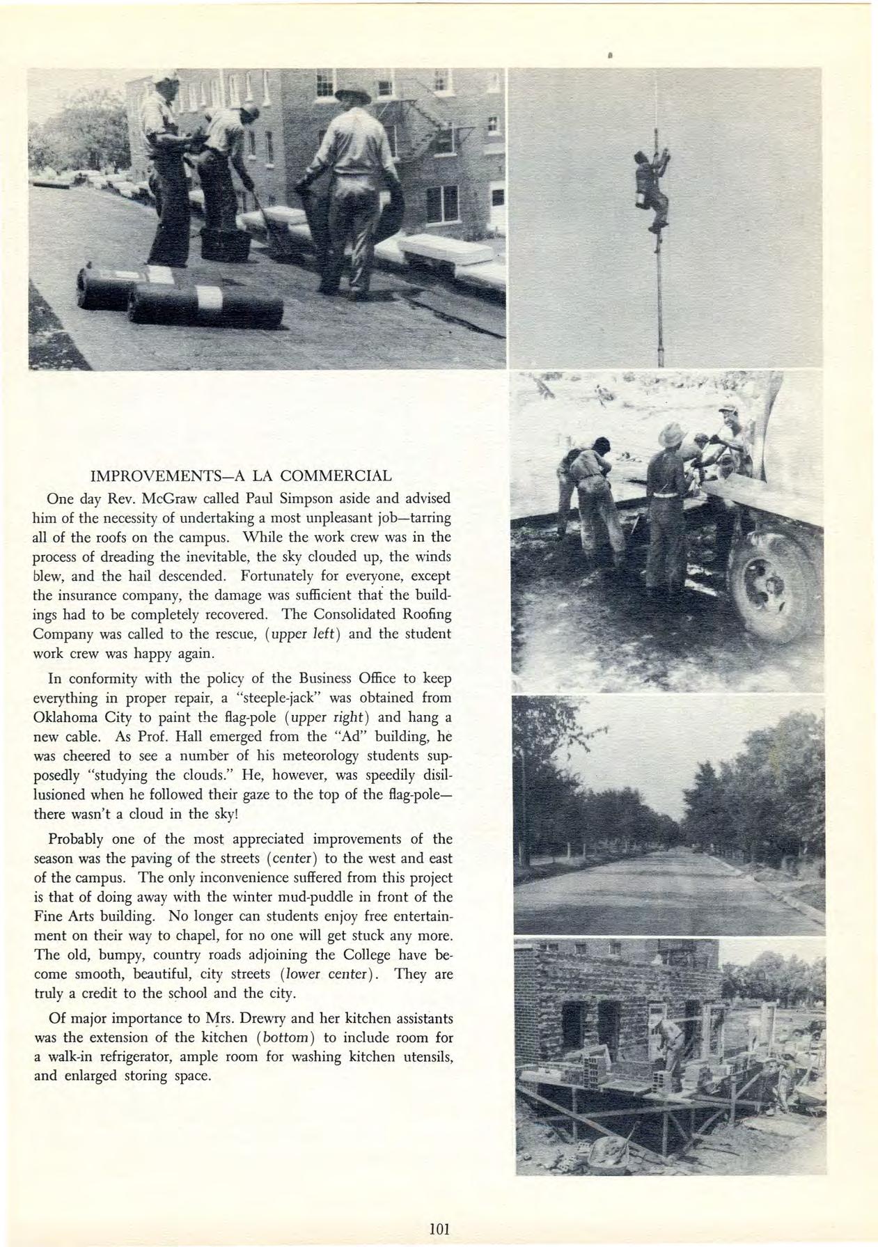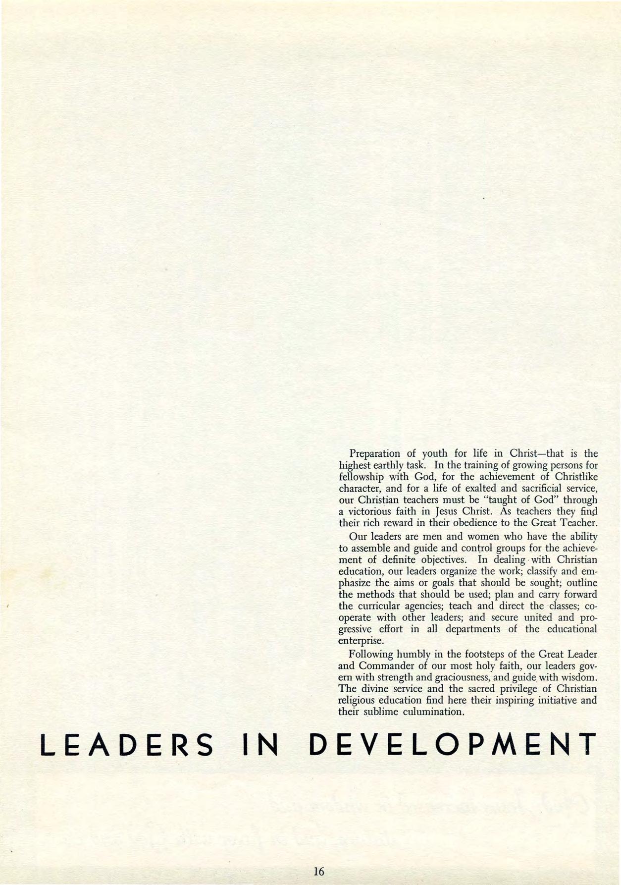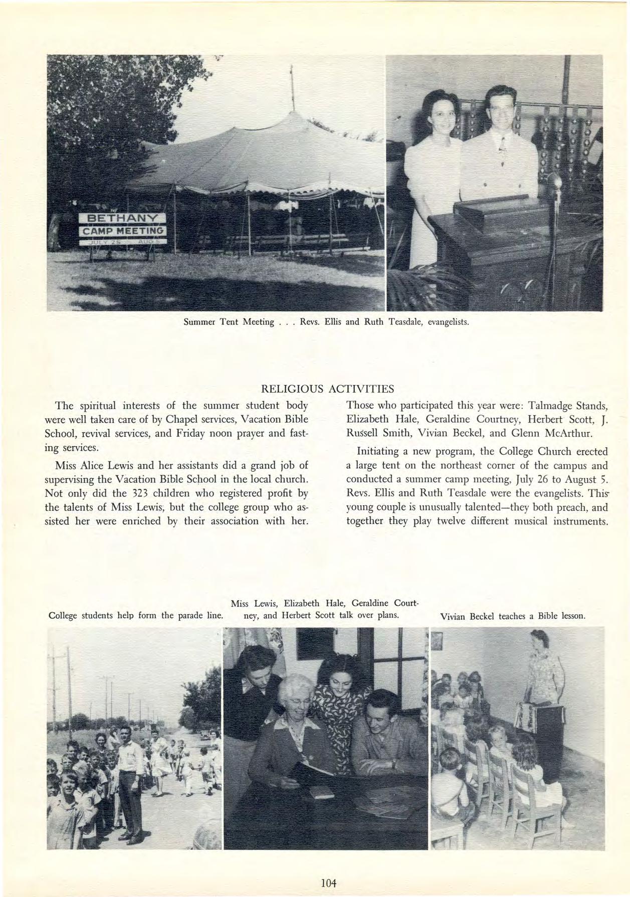A small group of holiness educational pioneers hewed from a blackjack grove their ideal of a Nazarene College. The prayers and dreams of yesterday were incorporated into the frames of two small buildings. Today, the results of these efforts may be seen in the seven permanent buildings and numerous tempo rary structures of our campus. Monuments to our forefathers, however, are not chiseled from material structures but are moulded from the character of young lives