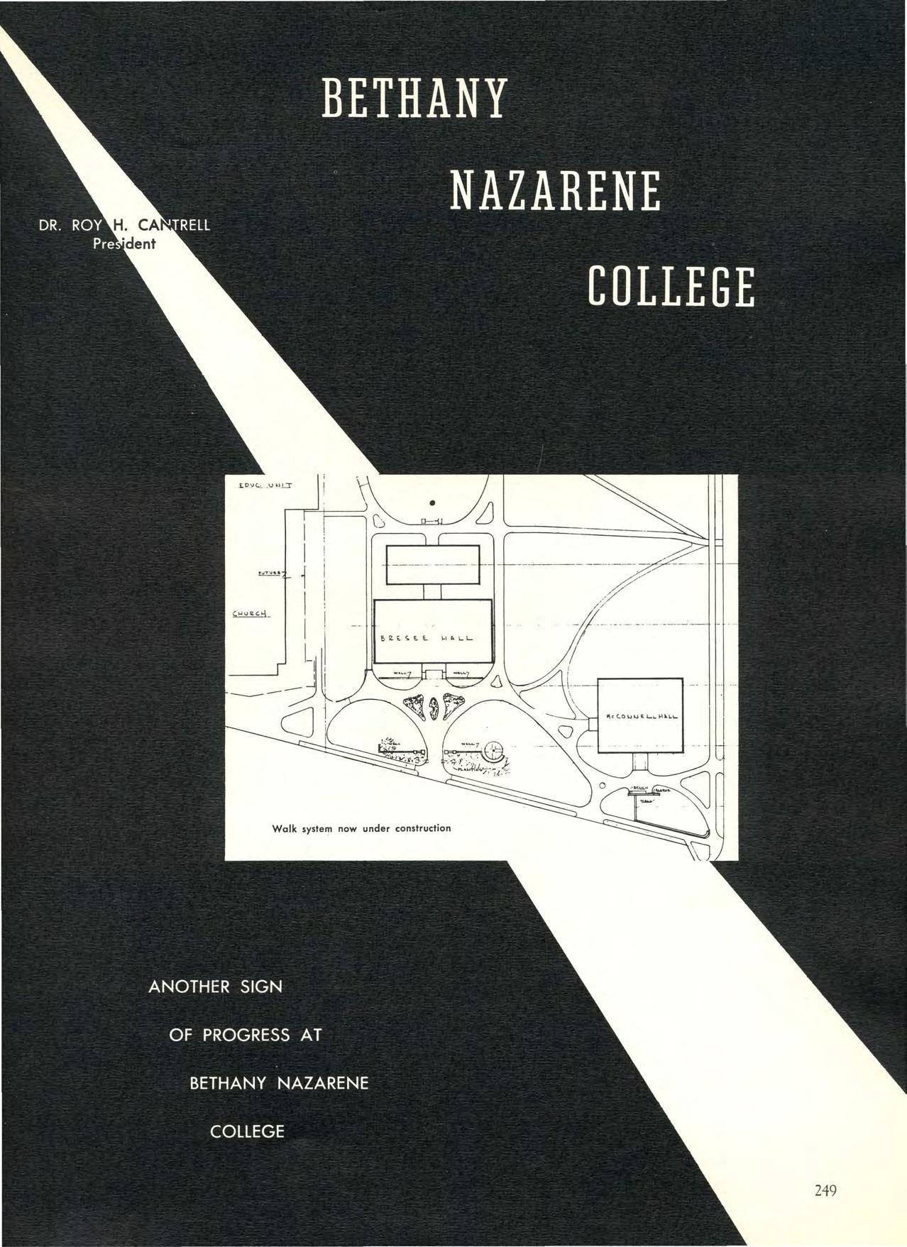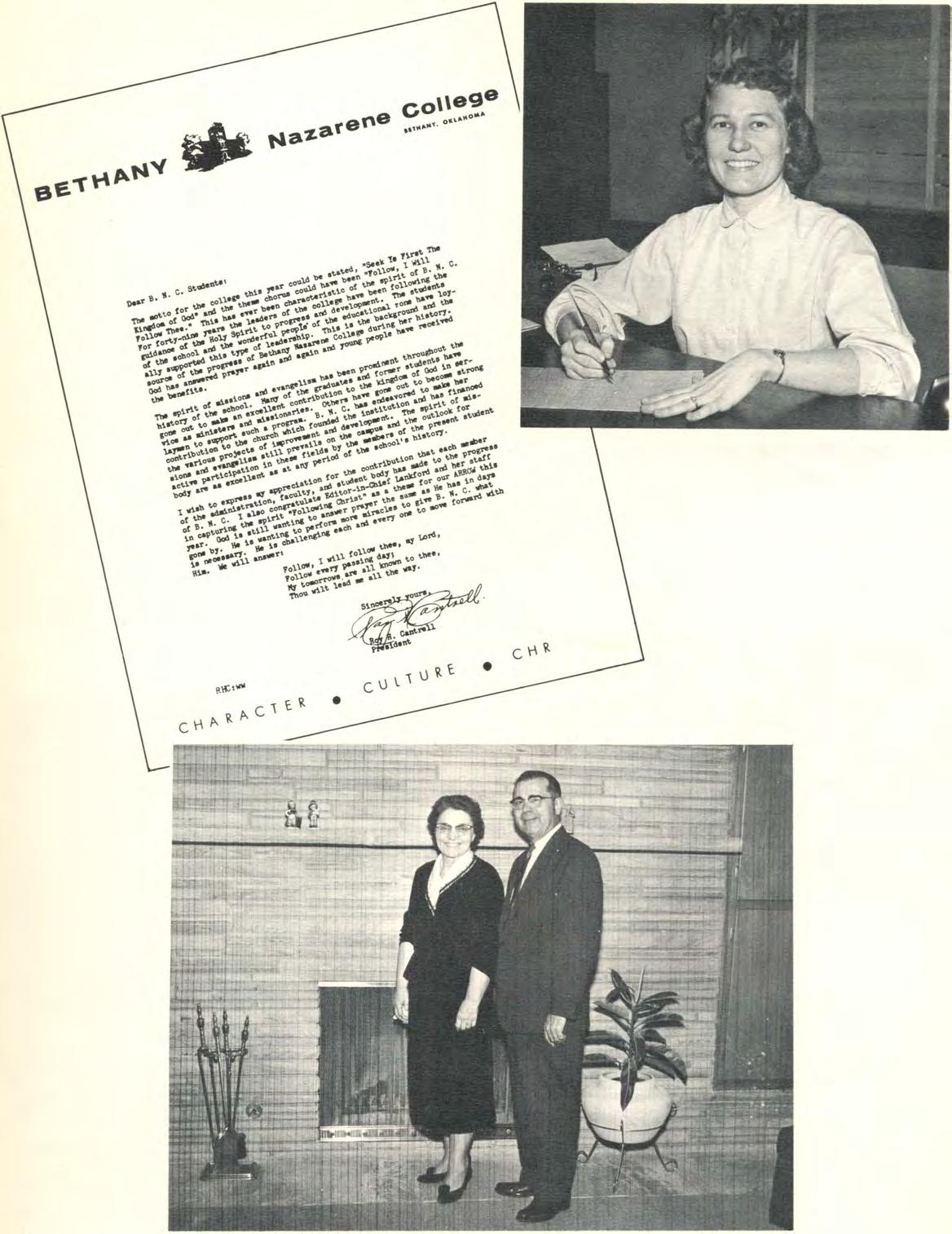 The personification of the motto ot the school -Character, Culture, Christ-is Mrs. Roy H. Cantrell, the "First Lady" of the campus, who serves as Counselor of Women. This position was especially created to serve the girls of the college, but Mrs. Cantrell is often looked to by the men also for answers to their problems. It may be a fine point of etiquette or a problem of homesickness to which she lends an understanding ear. She is an admirable Christian lady who definitely has the feminine side of the College at heart. Coupled with her desire to be of help socially is her desire for every girl who enters Bethany Nazarene College to live a Christ-filled and Christ-centered life.