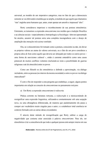 universal, ao modelo de um imperativo categórico, mas no fato de que a democracia somente se vai efetivando à medida que se amplia, à medida em que aquilo que chamamos “nós” engloba seres humanos que, antes, eram apenas um amorfo e impessoal “eles”. Rorty considerava imperioso o reconhecimento de sua postura etnocêntrica. Entretanto, se tomarmos a expressão etnocentrismo nos moldes que a tradição filosófica e as ciências sociais – especialmente a Antropologia e a Sociologia – têm-nos apresentado há séculos, assumir tal postura seria uma completa incongruência com o desejo de ampliação das intenções-nós acima ventilado. Ora, se o etnocentrismo for tomado como a postura, consciente ou não, de elevar os próprios valores ao status de valores universais, ou o fato de um povo considerar a própria ideia de bem como aquilo que deveria ser almejado por todos os outros povos – uma forma de narcisismo cultural –, então é coerente entendê-lo como uma causa potencial de muitos conflitos violentos (incluindo-se nisto a possibilidade de guerras religiosas e até de etnocídio) entre os povos. Como um filósofo se diz etnocêntrico e defende a aproximação, via diálogo includente, entre as pessoas (no interior da mesma sociedade) e entre os povos via diálogo intercultural? É com o fito de responder a esta pergunta que estabeleço, a seguir, alguns pontos importantes em relação ao conceito de etnocentrismo no pensamento rortyano. a) Em Rorty a expressão etnocentrismo é redescrita. Prática corrente na literatura rortyana, a redescrição é a técnica-método de ressignificar uma expressão linguística, utilizando-a constantemente sob uma acepção nova, ou uma abrangência diferenciada, de maneira que paulatinamente ela passa a compor um vocabulário muito singular para o autor, e a estabelecer total coerência no contexto formado com as outras ideias circundantes. É através deste método de ressignificação que Rorty subtrai a carga de negatividade que costuma estar associada à palavra etnocentrismo. Para ele, ser etnocêntrico é ter a consciência de que toda e qualquer pessoa está sempre imerso em sua