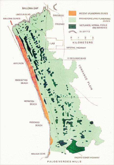 A quarter mile inland started the Great Los Angeles Coastal Prarie, an extinct habitat, which was home to many wildflowers and wild bunchgrasses. Interspersed were vernal pools and marshes. Unlike the dunes, the substrate of the habitat was older consolidated sand instead of shifting sand. Although historically inaccurate to site, this could be the ecology which is restored.