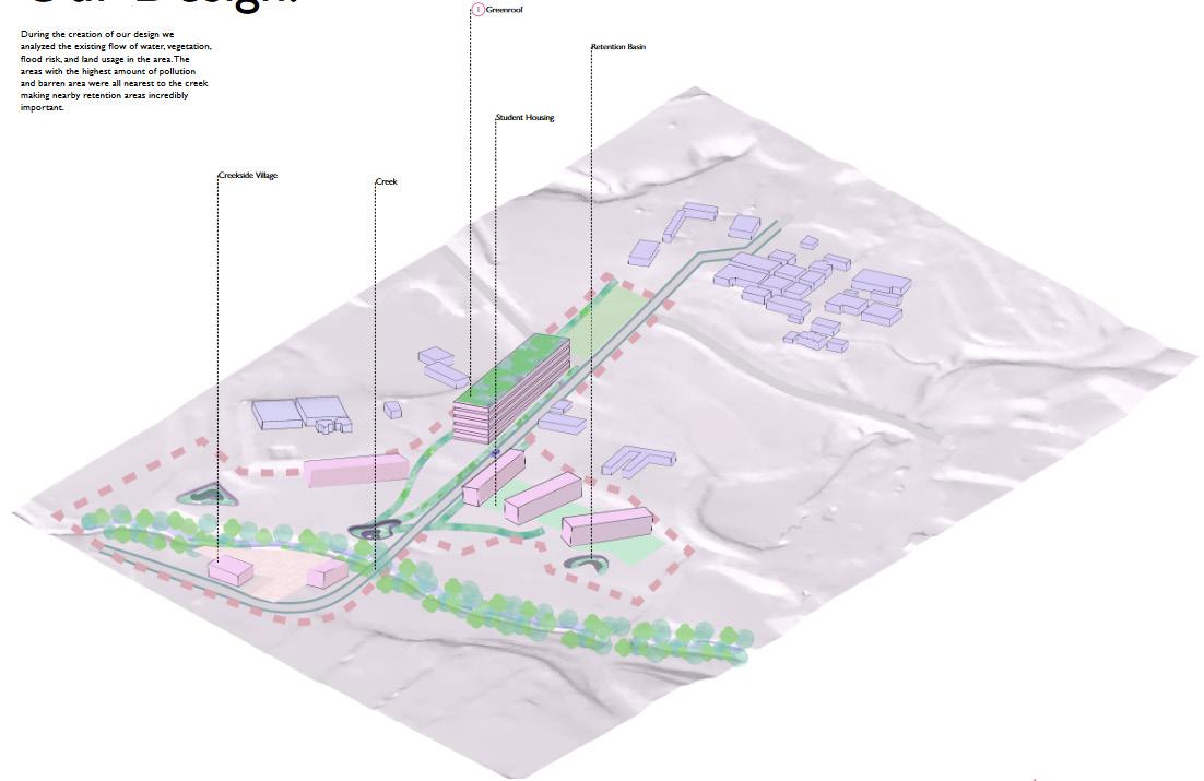 The parking area at the north of campus is planned to be converted into student housing. This area currently experiences an incline which funnels heavy metals, farm refuse, and chemicals into the creek. We took water surveys of the existing problems endemic to the site and provided green infrastructure solutions. These solutions solve 3 major problems: stream pollution, poor circulation, and disconnection between the arboretum and the campus core