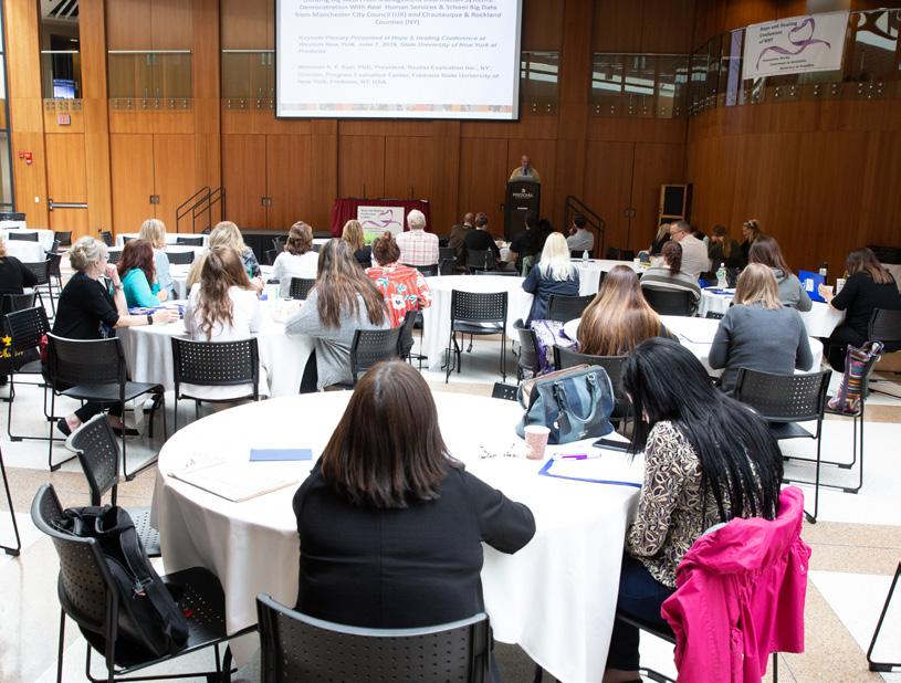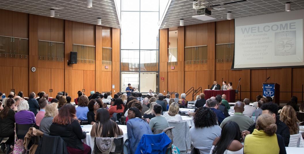 A podium is available for formal presentations and includes a microphone. The building podium contains the Fredonia logo.
