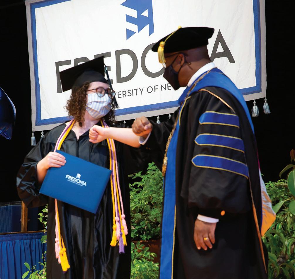 Key principals of Fredonia Commencements recognized these soon-to-be-minted graduates. President Stephen H. Kolison Jr., in his first year at Fredonia, acknowledged each graduate and engaged in the ubiquitous elbow bump that’s supplanted traditional handshakes.
